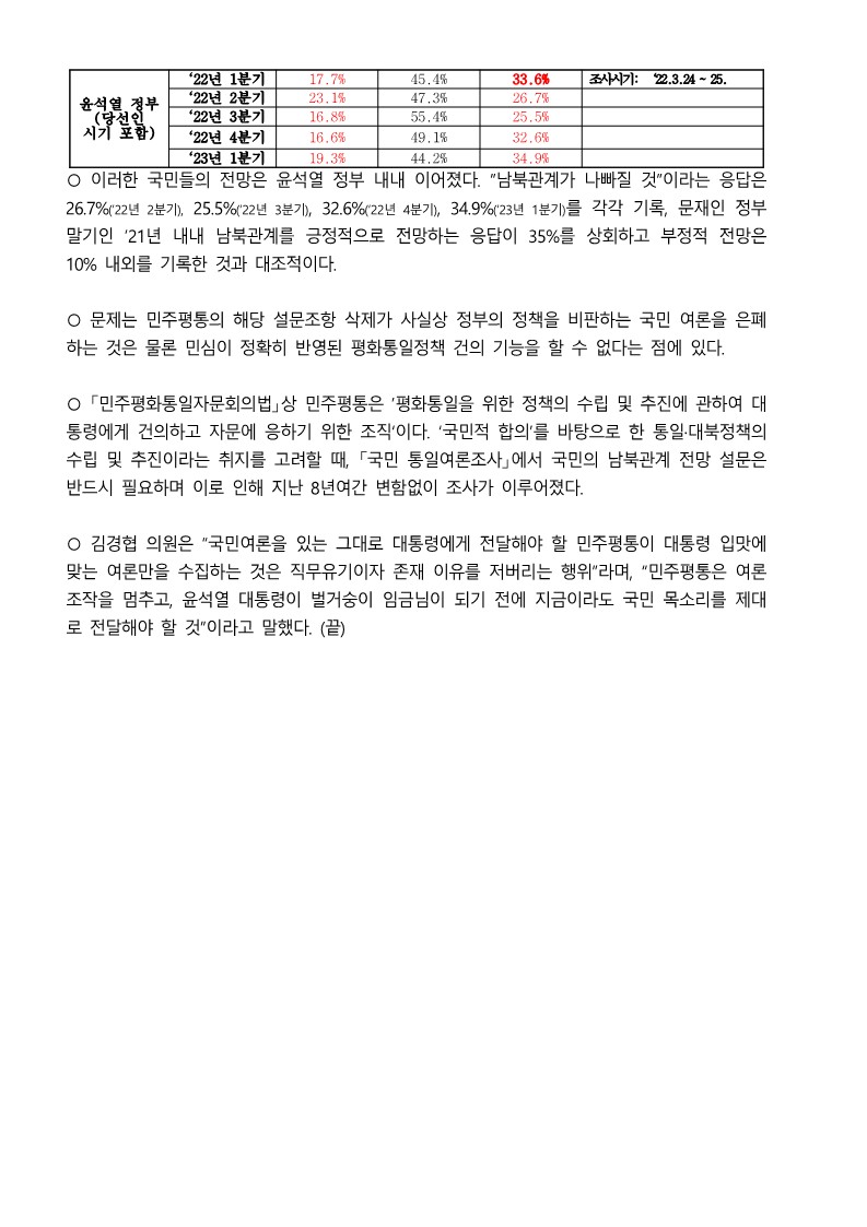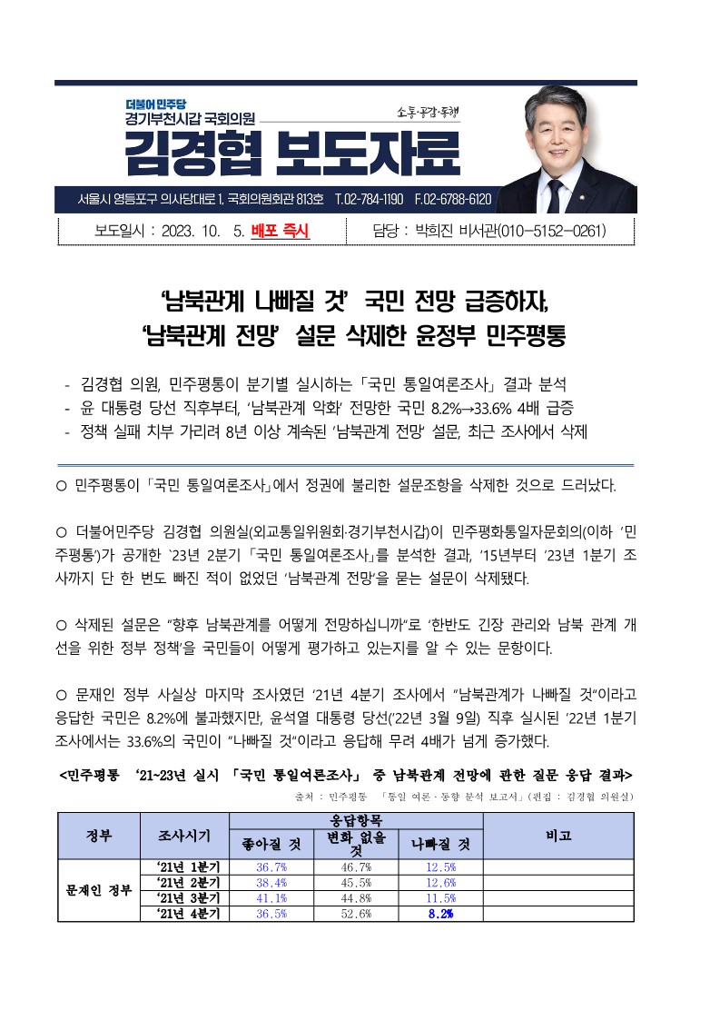 [국회의원 김경협 국정감사 보도자료] ‘남북관계 나빠질 것’국민 전망 급증하자, ‘남북관계 전망’설문 삭제한 윤정부 민주평통