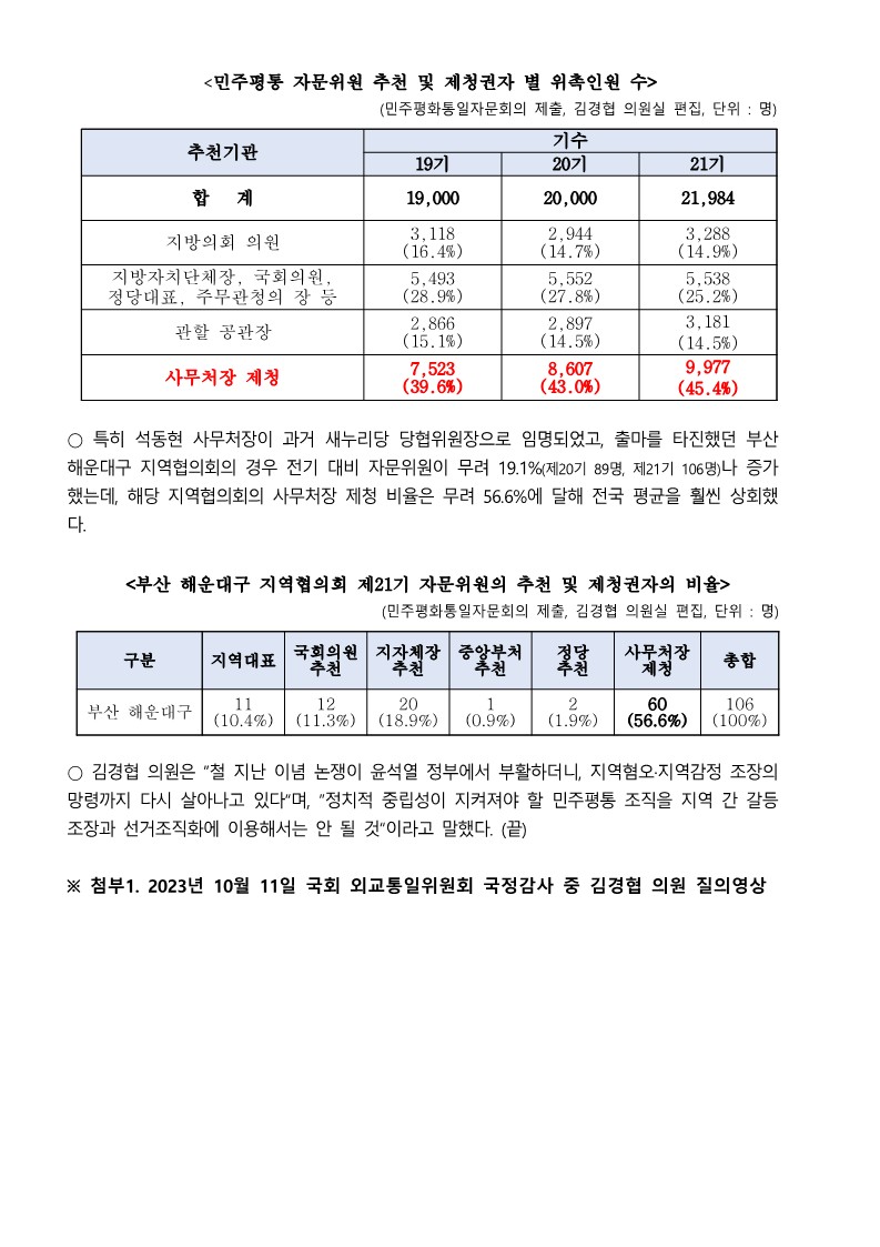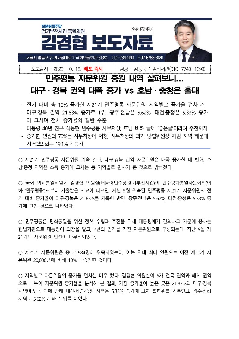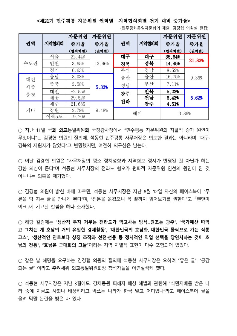 [국회의원 김경협 국정감사 보도자료] 민주평통 자문위원 증원 내역 살펴보니...대구·경북 권역 대폭 증가 vs 호남·충청은 홀대