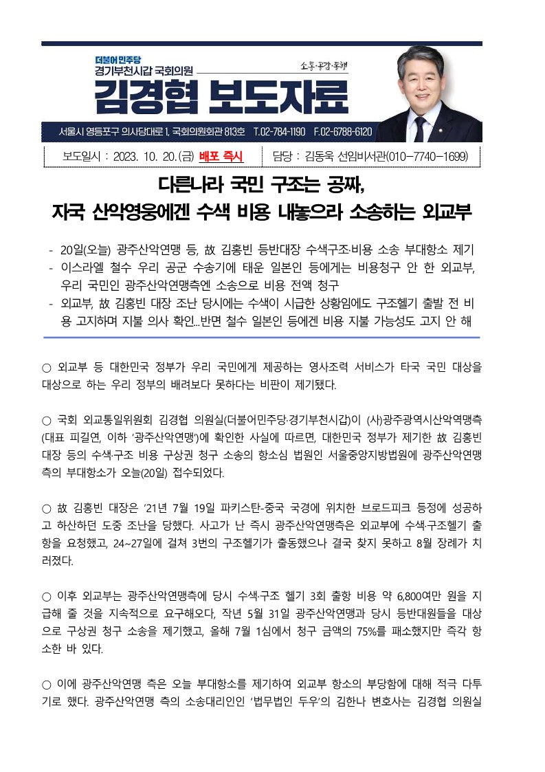 [국회의원 김경협 국정감사 보도자료] 다른나라 국민 구조는 공짜, 자국 산악영웅에겐 수색 비용 내놓으라 소송하는 외교부
