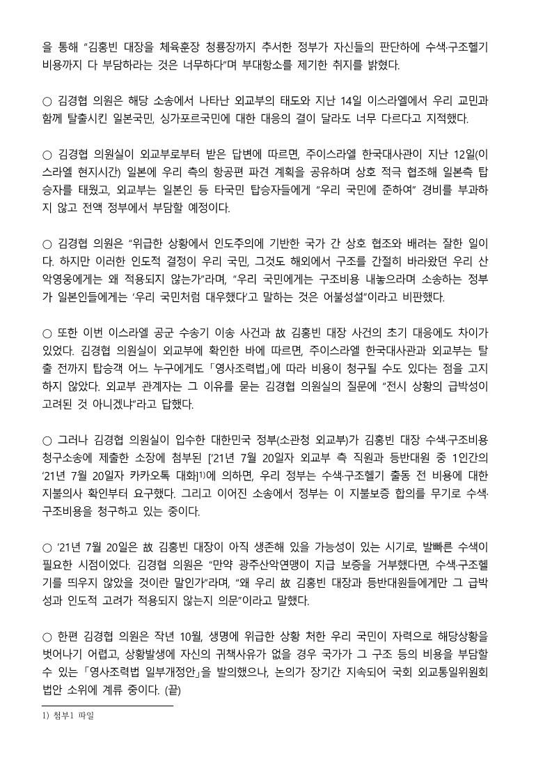 [국회의원 김경협 국정감사 보도자료] 다른나라 국민 구조는 공짜 자국 산악영웅에겐 수색 비용 내놓으라 소송하는 외교부.hwp