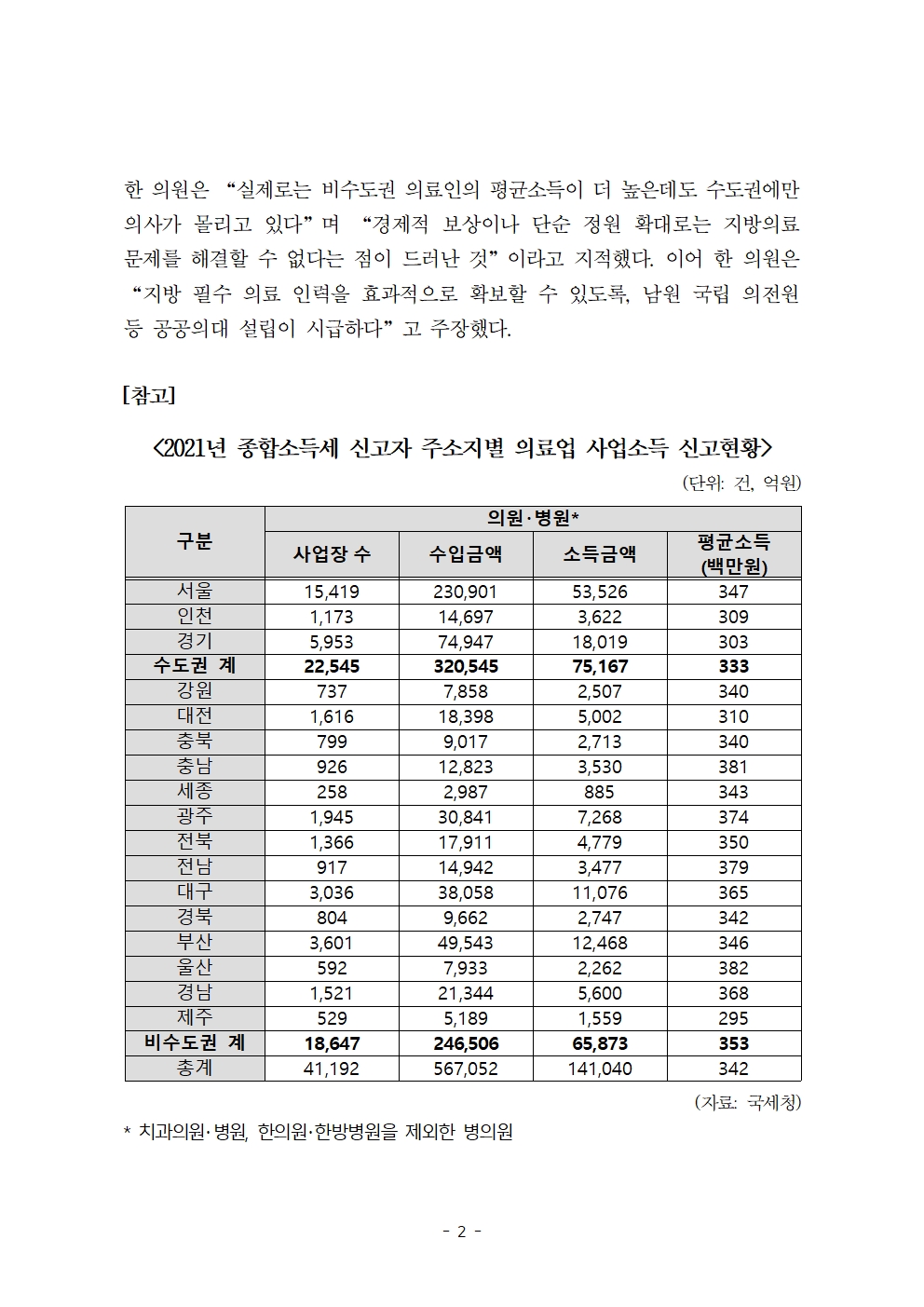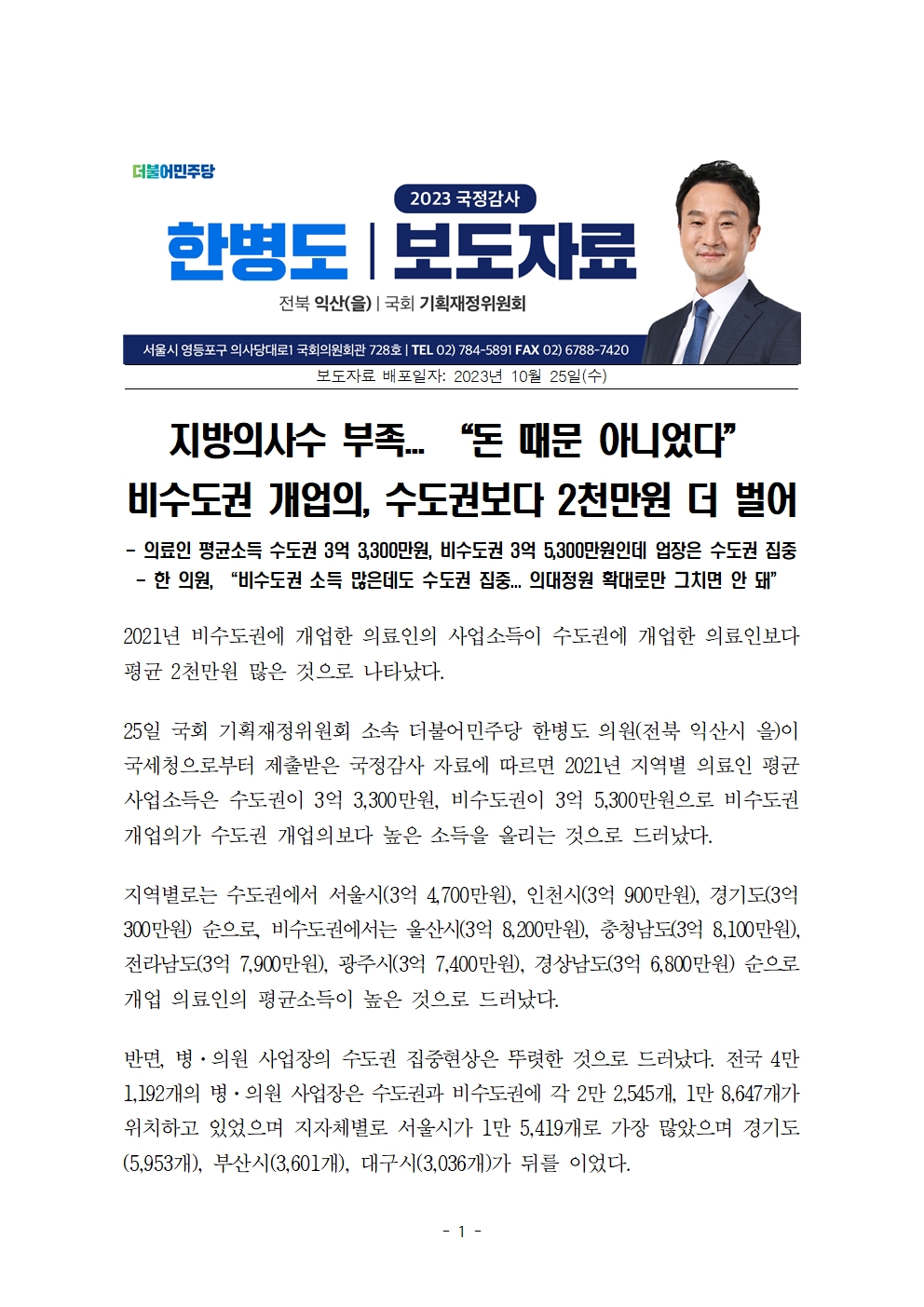 [국회의원 한병도 국감 보도자료] 지방의사수 부족... “돈 때문 아니었다” 비수도권 개업의, 수도권보다 2천만원 더 벌어