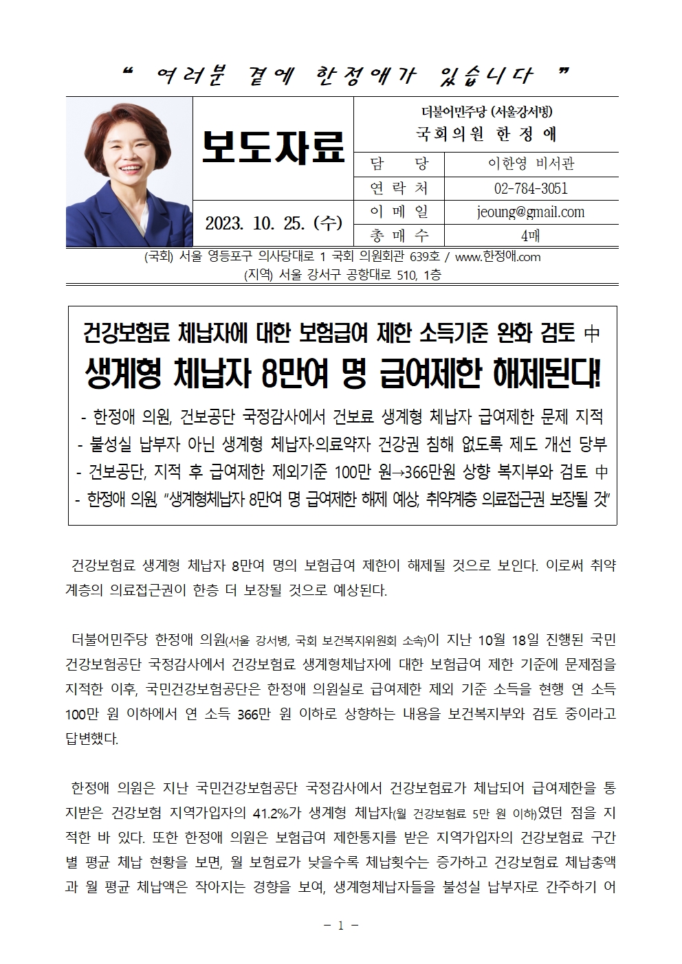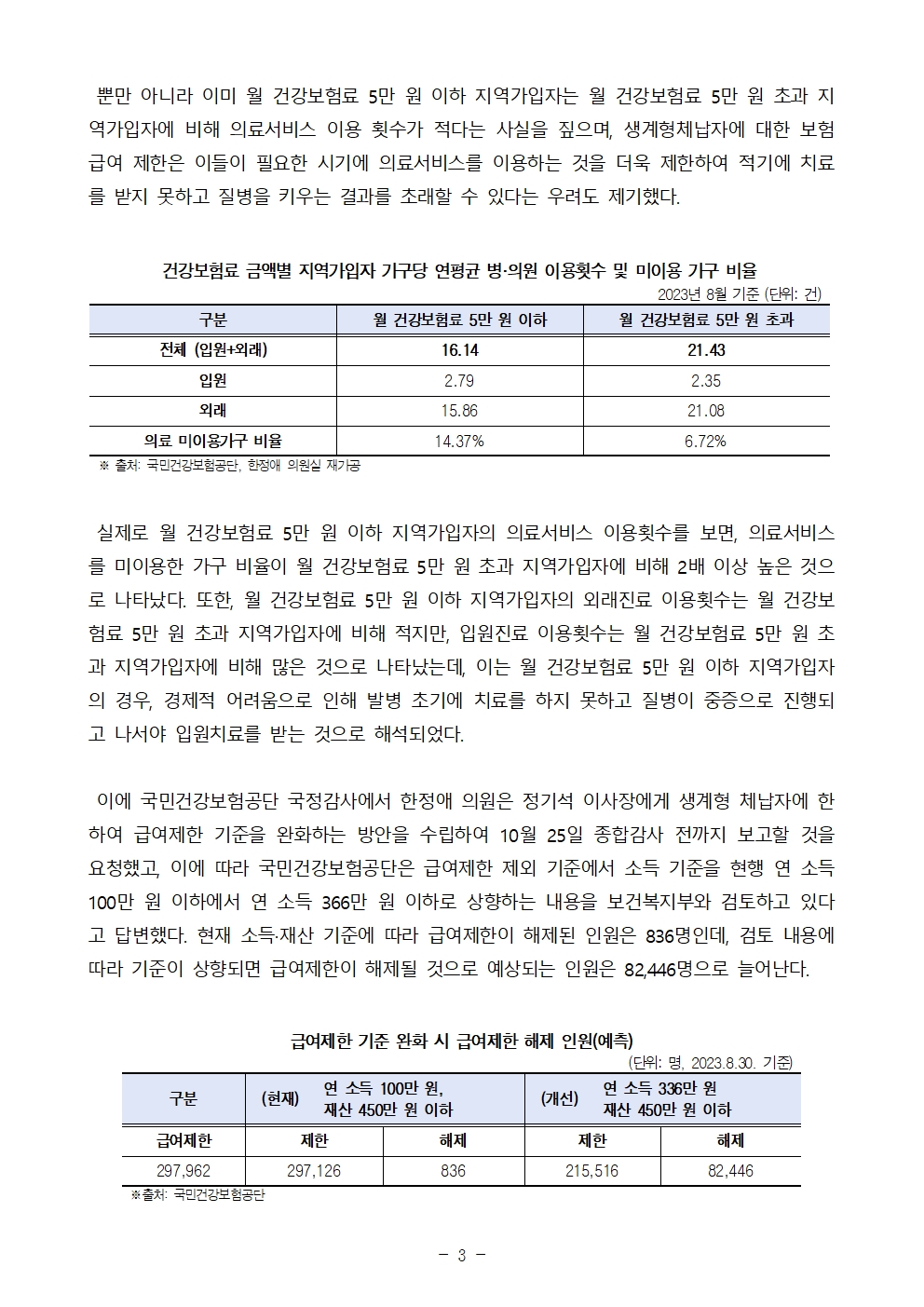 231025 [한정애 의원 국정감사 보도자료] 건보료 체납자 급여 제한 기준 완화 검토 8만 여명 급여제한 해제된다.hwp