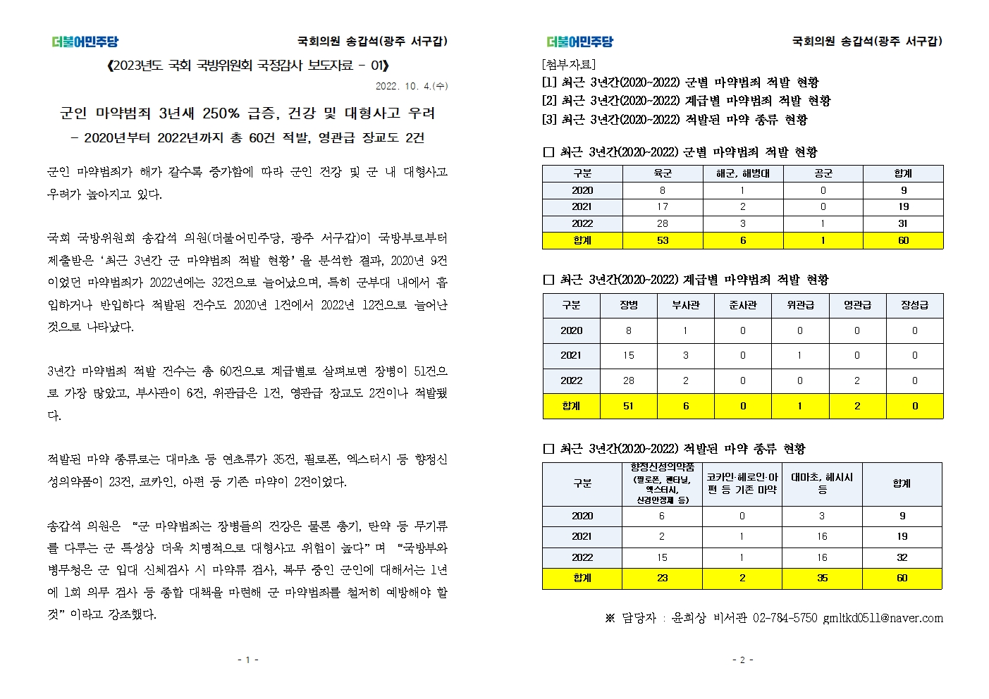[국회의원 송갑석 국정감사 보도자료] 군인 마약범죄 3년새 250% 급증, 건강 및 대형사고 우려