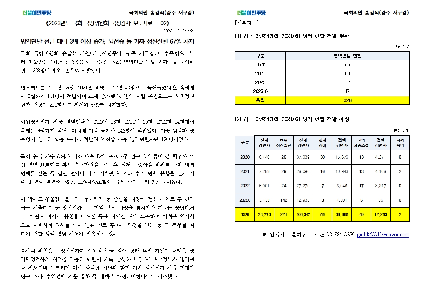 [국회의원 송갑석 국정감사 보도자료] 병역면탈 전년 대비 3배 이상 증가, 뇌전증 등 가짜 정신질환 67% 차지