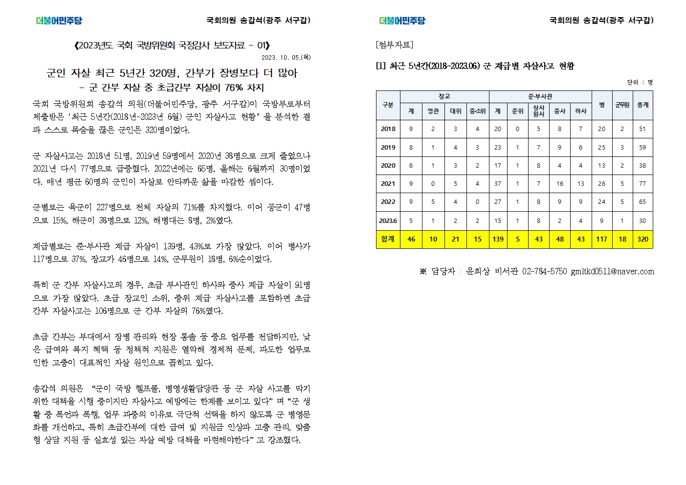 [국회의원 송갑석 국정감사 보도자료] 군인 자살 최근 5년간 320명, 간부가 장병보다 더 많아