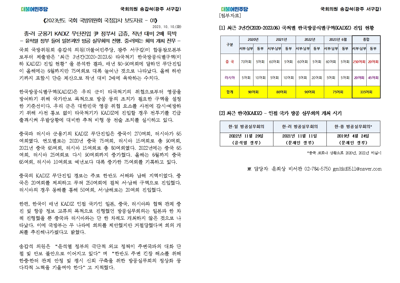 [국회의원 송갑석 국정감사 보도자료] 중,러 군용기 KADIZ 무단진입 尹 정부서 급증, 작년 대비 2배 육박
