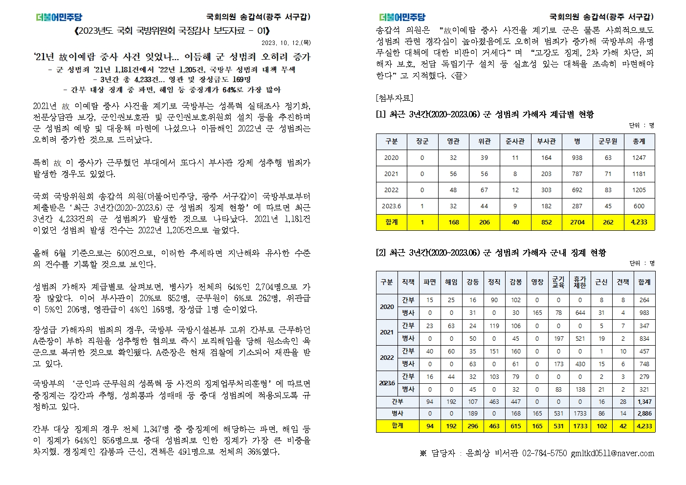 [국회의원 송갑석 국정감사 보도자료] `21년 故이예람 중사 사건 잊었나... 이듬해 군 성범죄 오히려 증가
