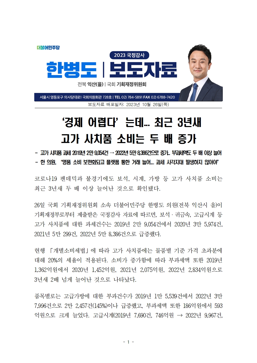 [국회의원 한병도 국감 보도자료] ‘경제 어렵다’는데... 최근 3년새 고가 사치품 소비는 두 배 증가