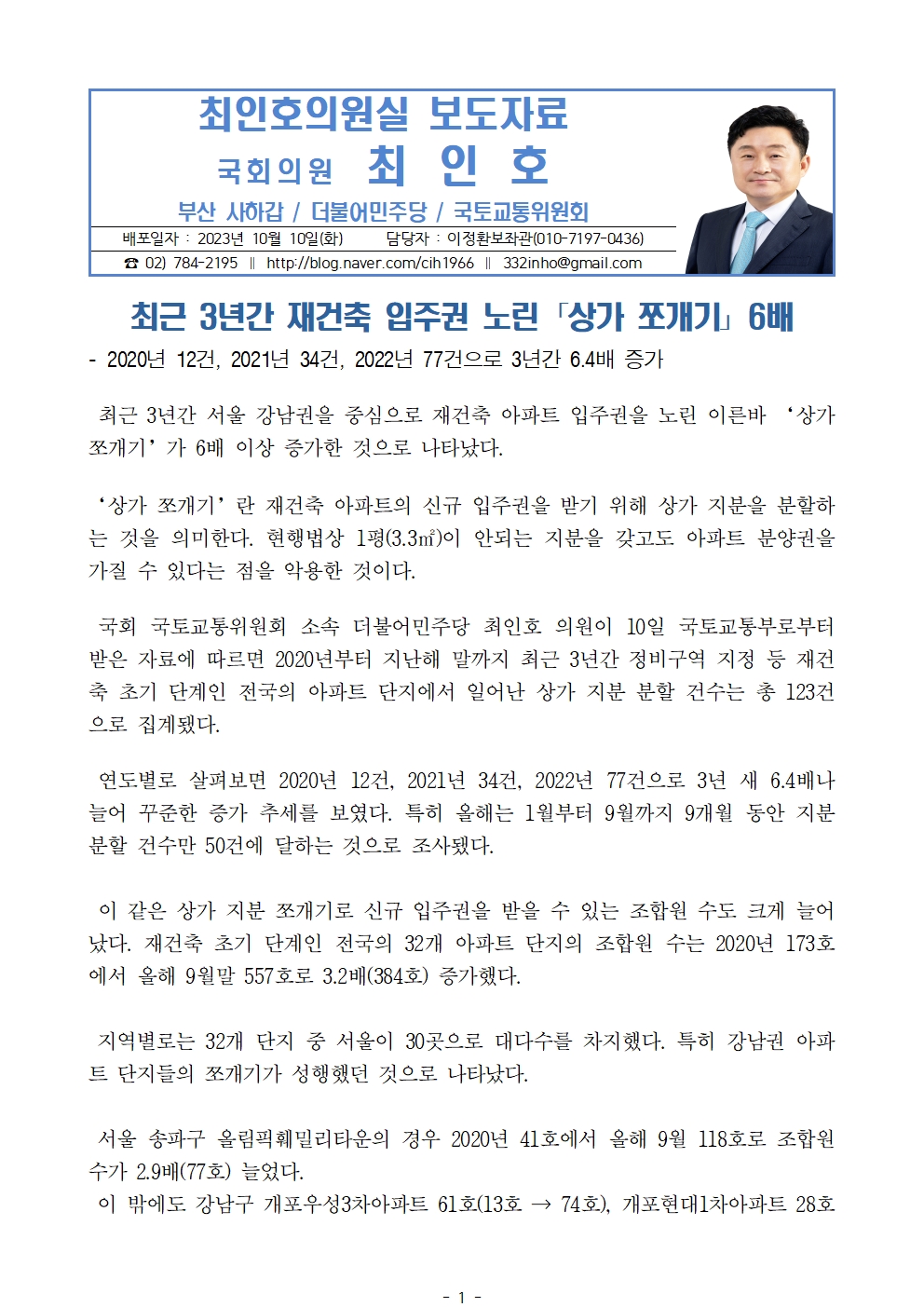 [최인호 의원 보도자료] 최근 3년간 재건축 입주권 노린 「상가 쪼개기」 6배