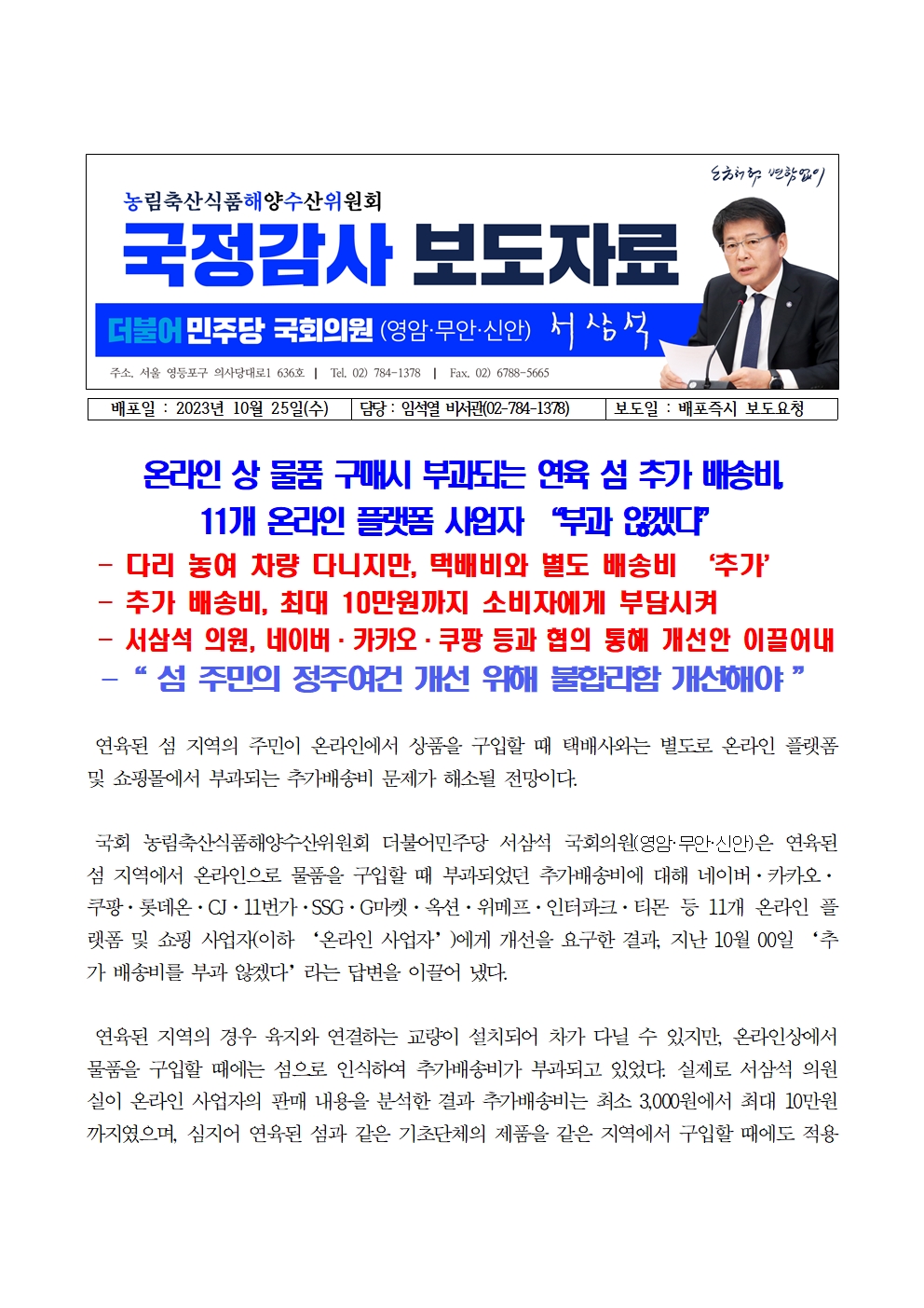 [서삼석 국회의원] 231025_온라인 상 물품 구매시 부과되는 연육 섬 추가 배송비