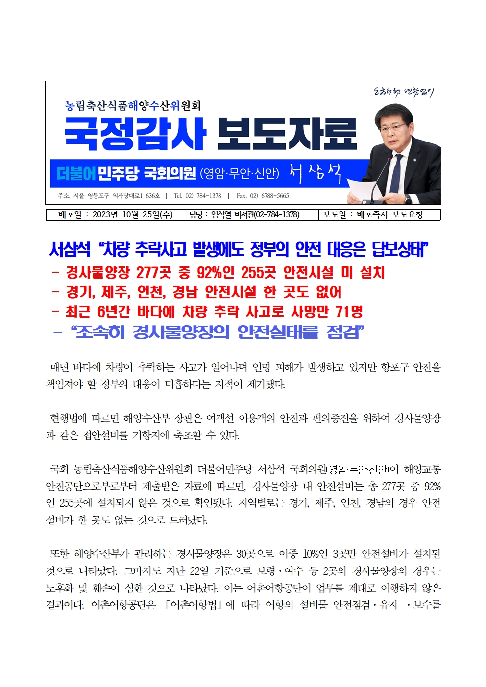 231025_[서삼석 국회의원] 차량 추락사고 발생에도 정부의 안전 대응은 답보상태(최종).hwp