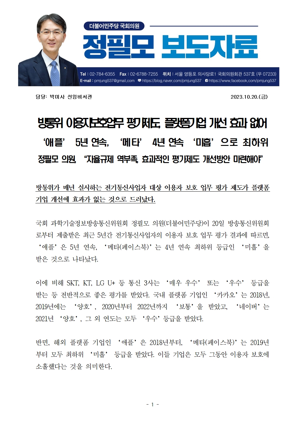 [정필모 의원 보도자료] 방통위 이용자보호업무 평가제도, 플랫폼기업 개선 효과 없어
