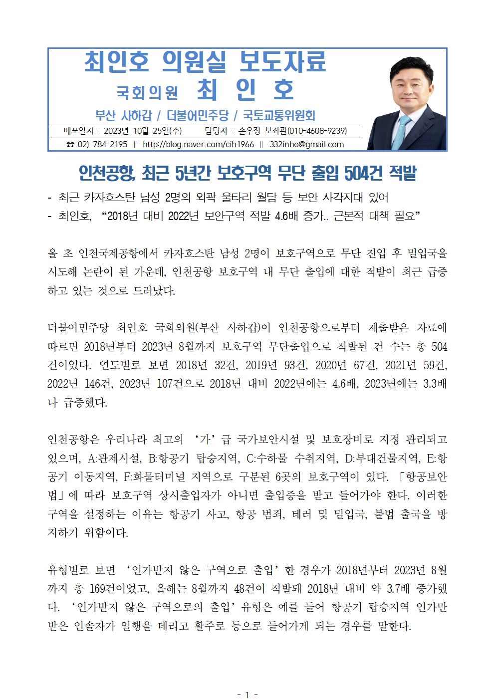 [최인호 의원 보도자료] 인천공항, 최근 5년간 보호구역 무단 출입 504건 적발