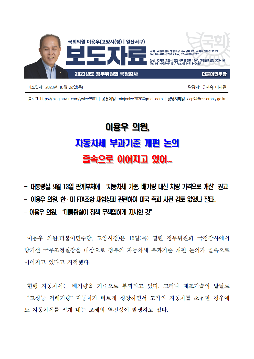 [보도자료] 이용우 의원_ 자동차세 부과기준 개편논의 졸속으로 이어지고 있어...hwp