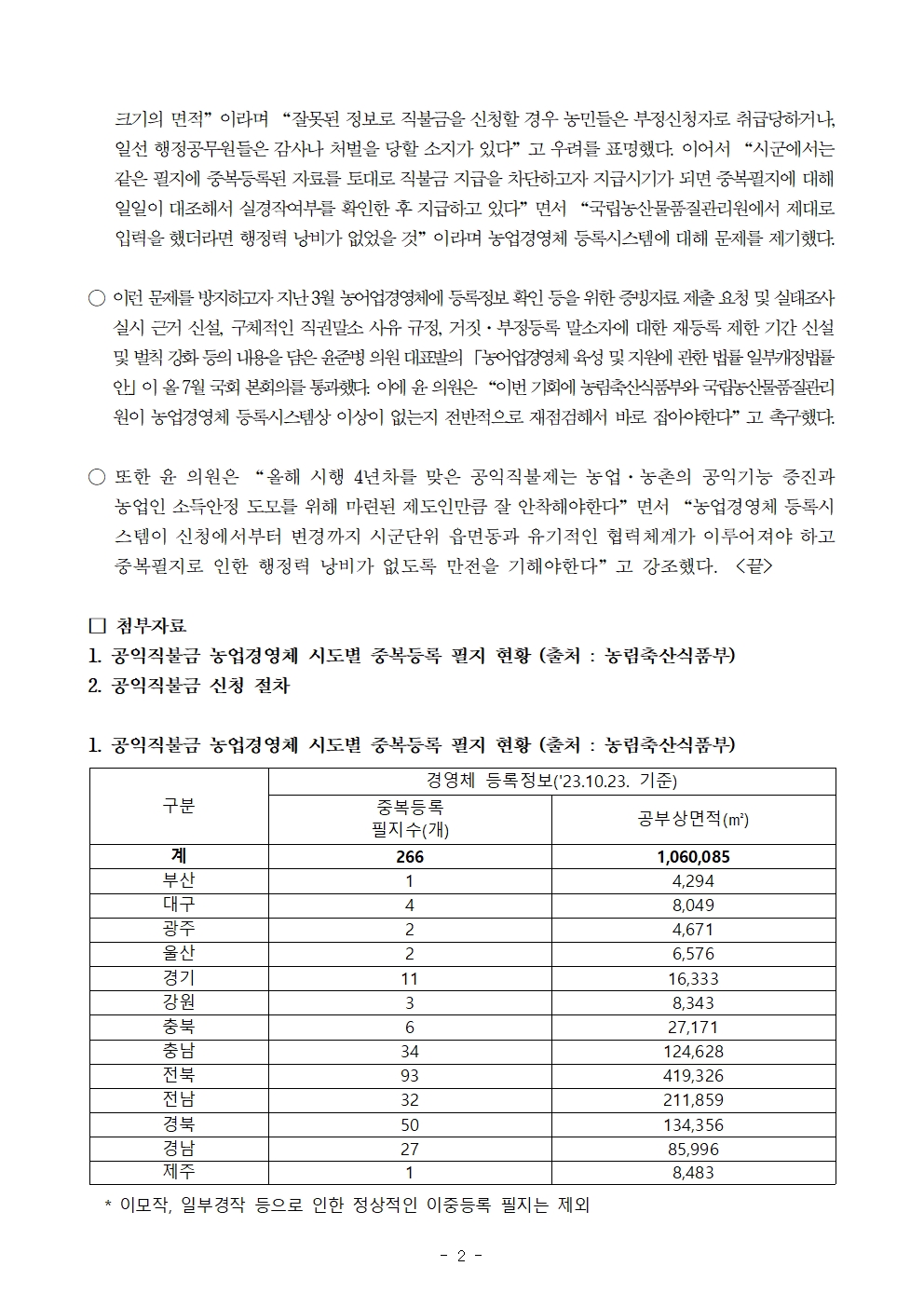231025 [윤준병 의원 국정감사 보도자료] 윤준병 의원_ 공익직불금 농업경영체 등록시스템 중복등록 필지 문제 지적! (1).hwp