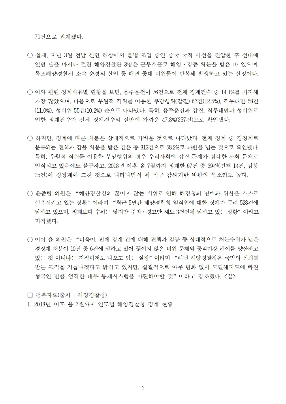 [윤준병 의원 국정감사 보도자료] 윤준병 의원, “음주운전·갑질·직무태만·성비위 등으로 얼룩진 해경”