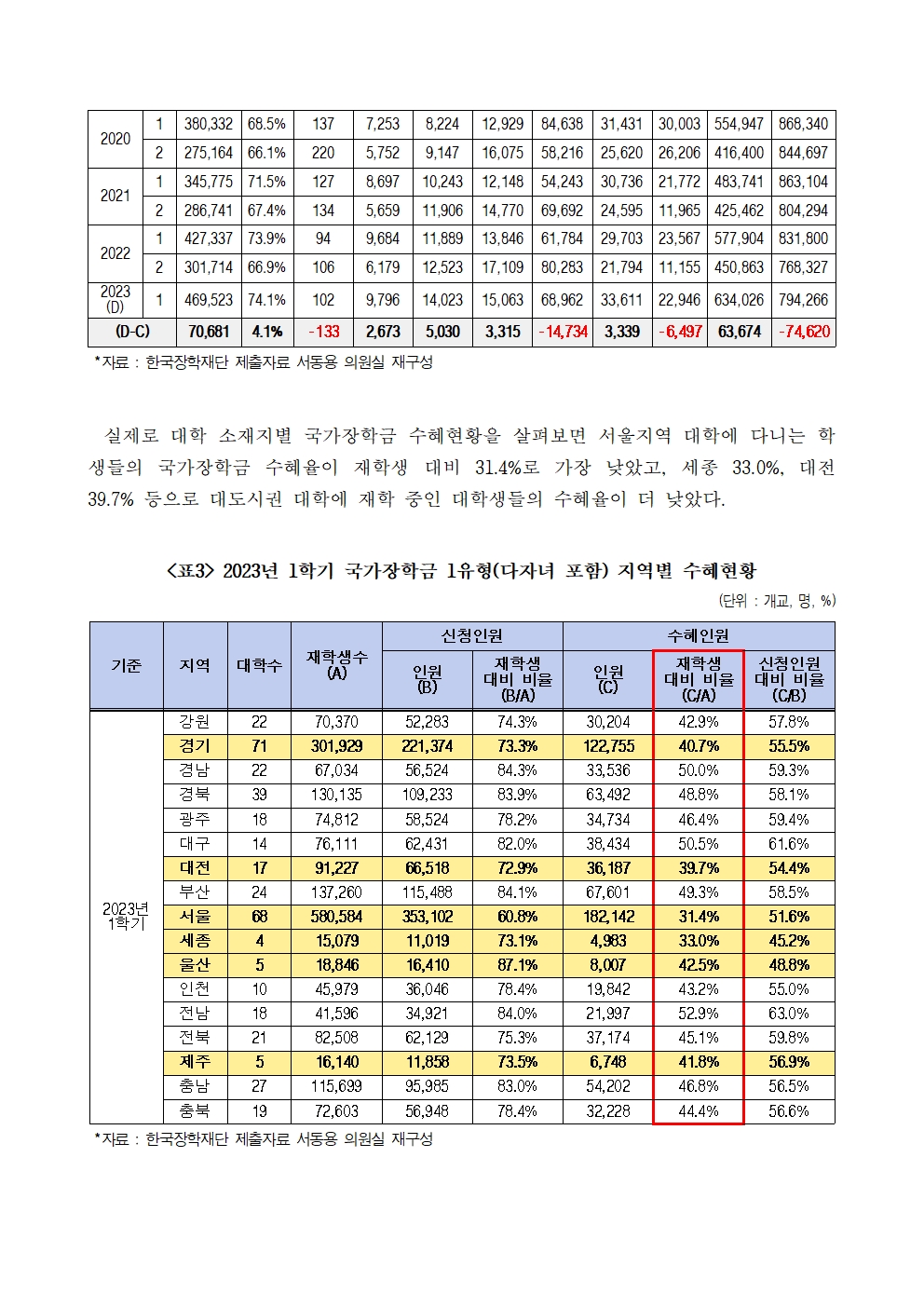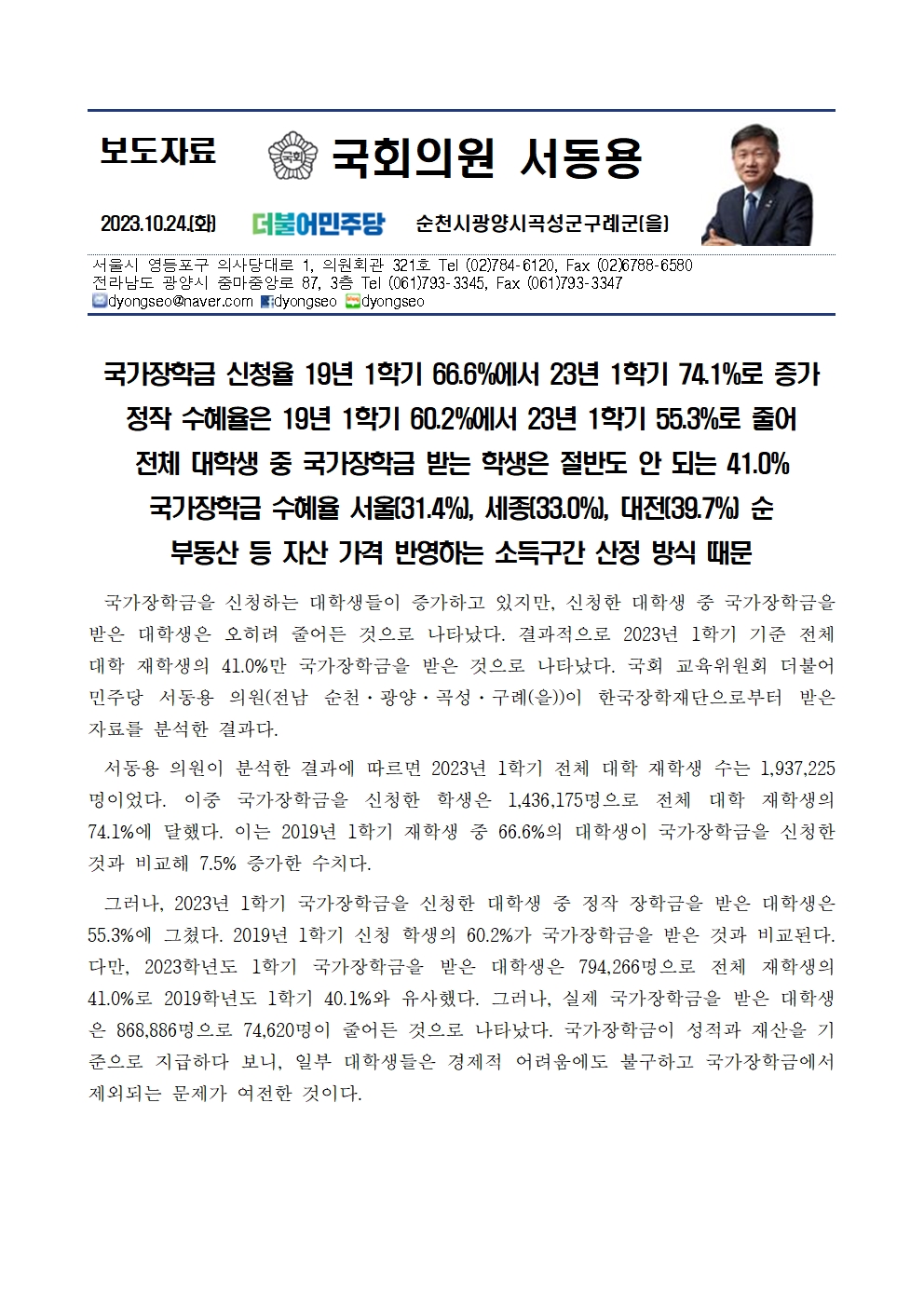 231024_국감_서동용_국가장학금_신청율_19년_1학기_66_6퍼센트에서_23년_1학기_74_1퍼센트로_증가.hwp