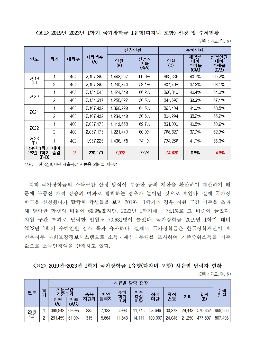 [서동용 의원] 국가장학금 신청율 19년 1학기 66.6%에서 23년 1학기 74.1%로 증가 정작 수혜율은 19년 1학기 60.2%에서 23년 1학기 55.3%로 줄어