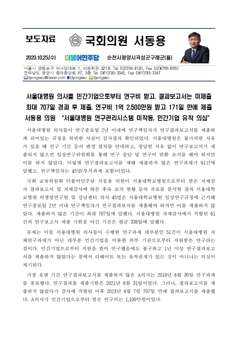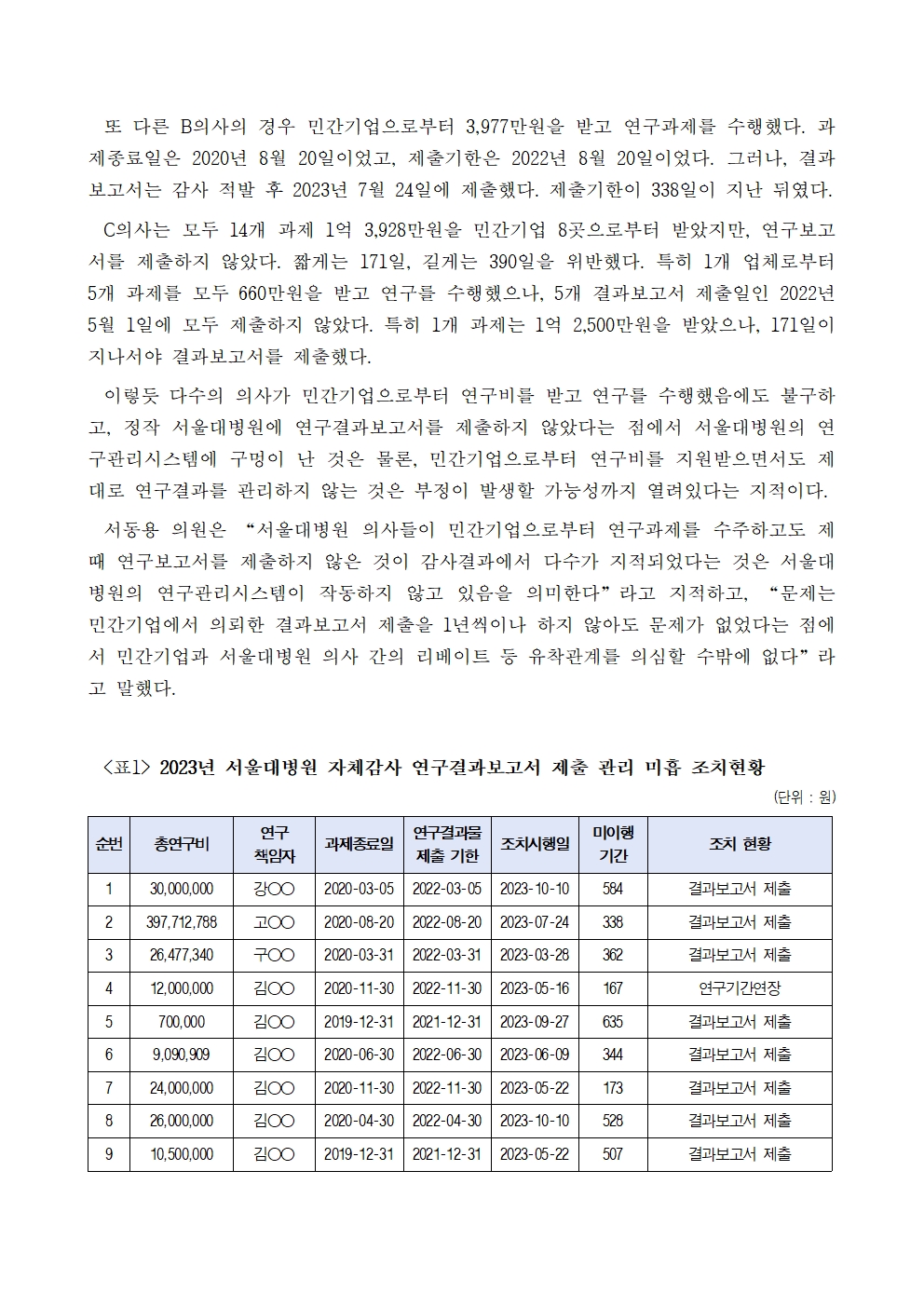 231025_국감_서동용_서울대병원_의사들_민간_기업으로부터_연구비_받고_결과보고서는_미제출.hwp