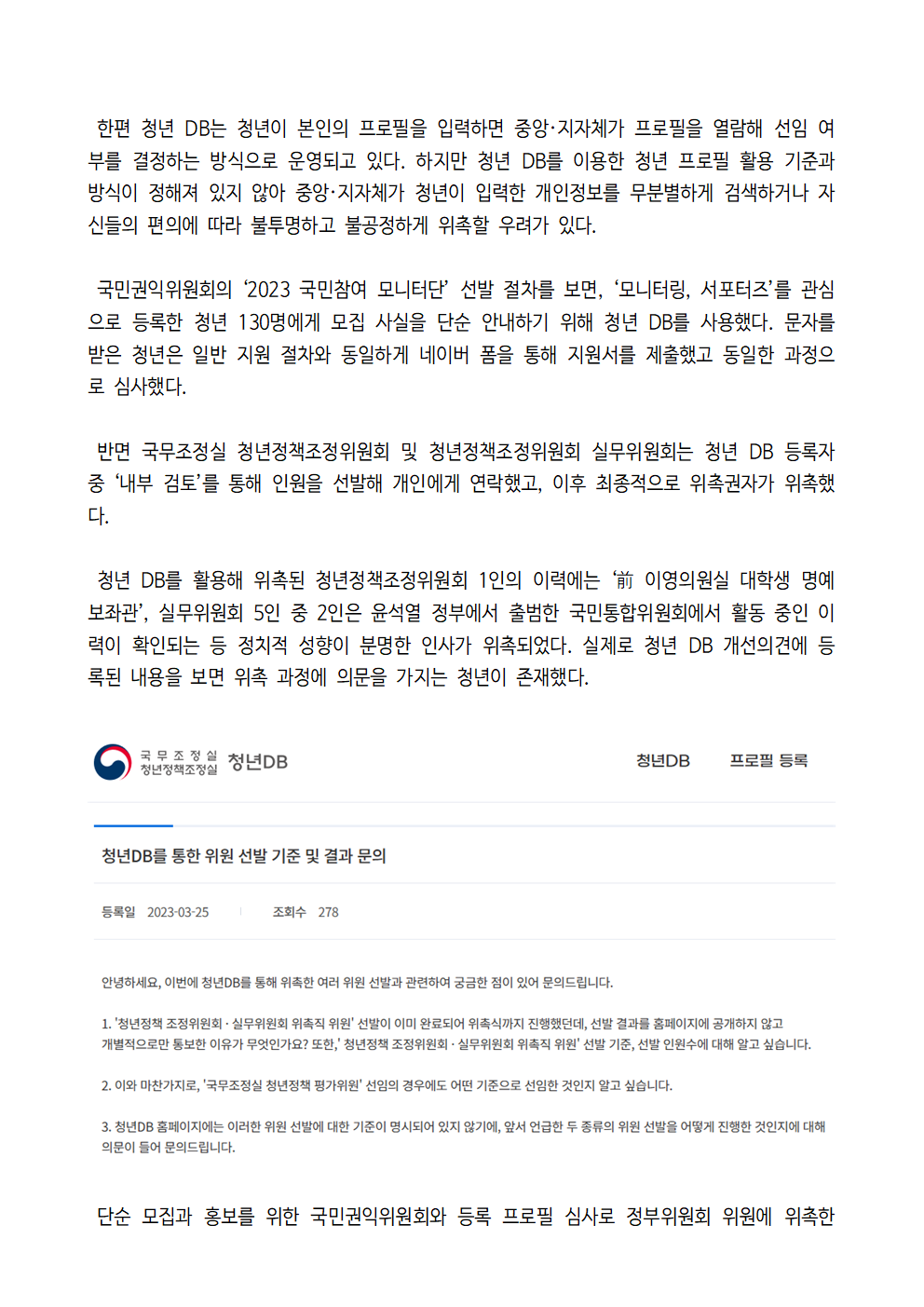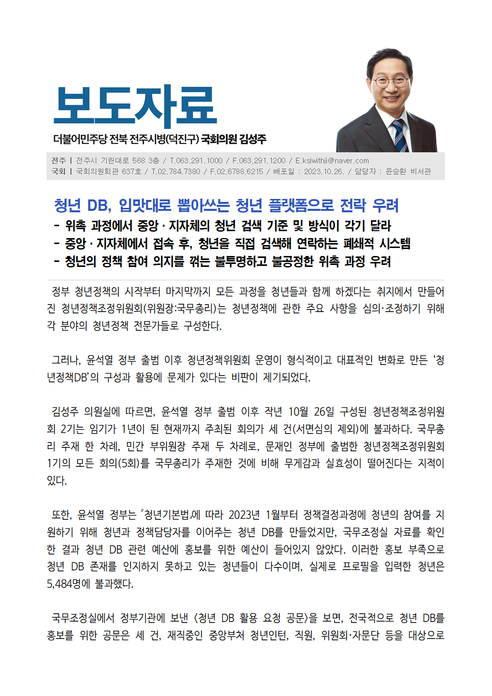 [김성주의원 보도자료] 청년 DB, 입맛대로 뽑아쓰는 청년 플랫폼으로 전락 우려
