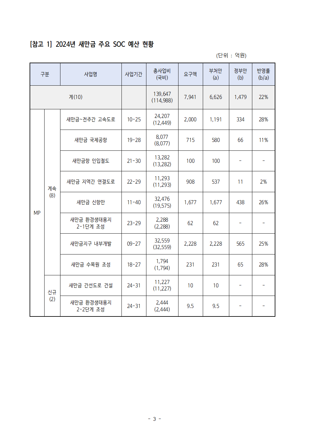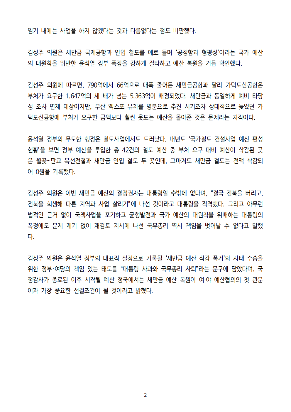 [김성주의원 보도자료] 국정감사 이후 여‧야 예산협의 첫 관문은 새만금 예산 복원