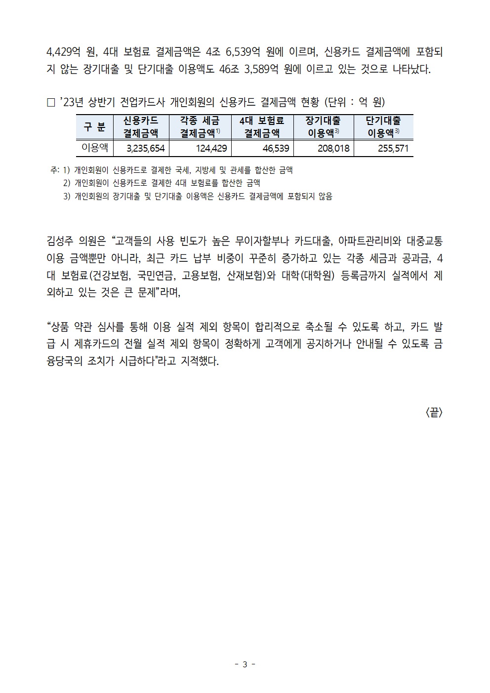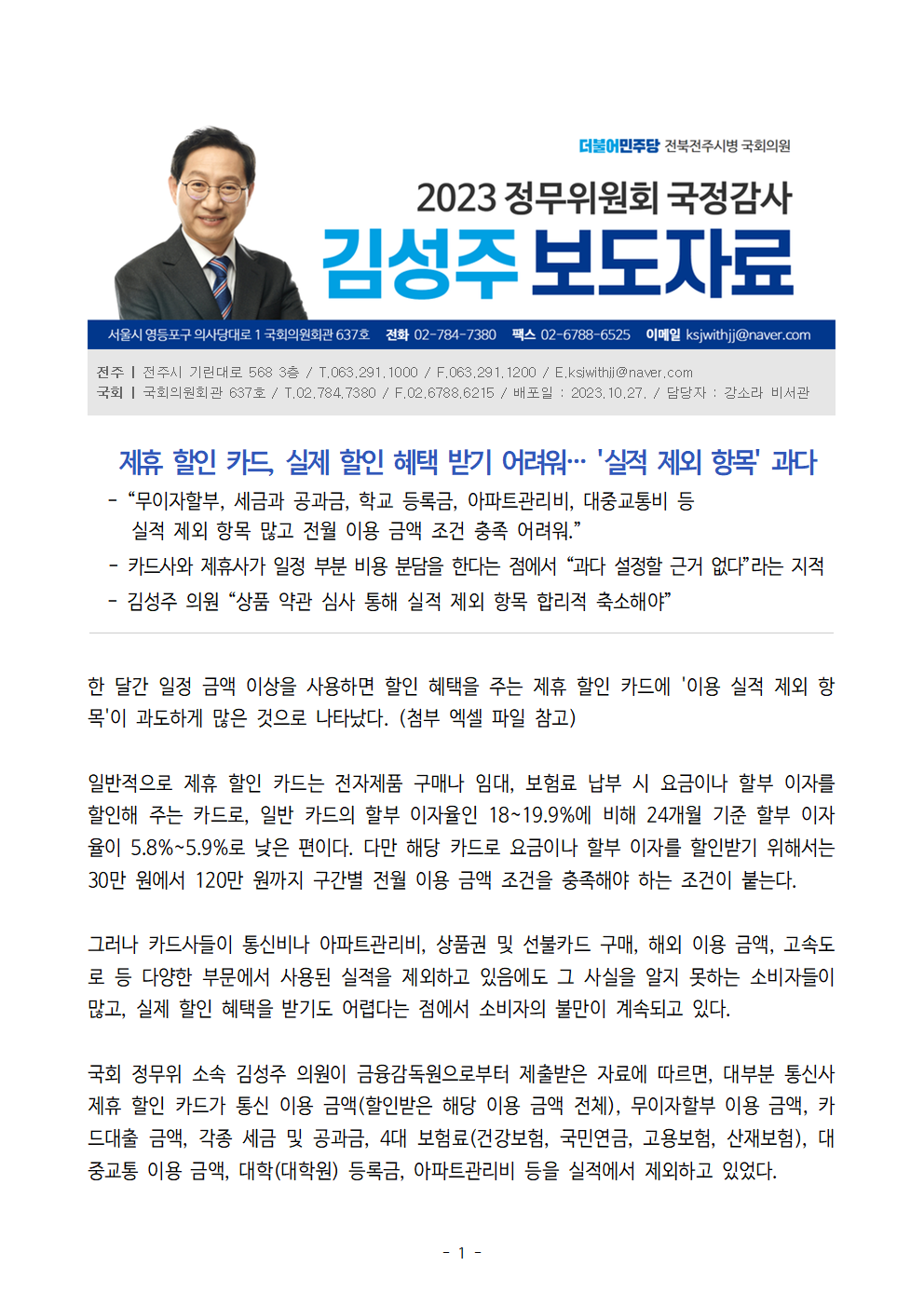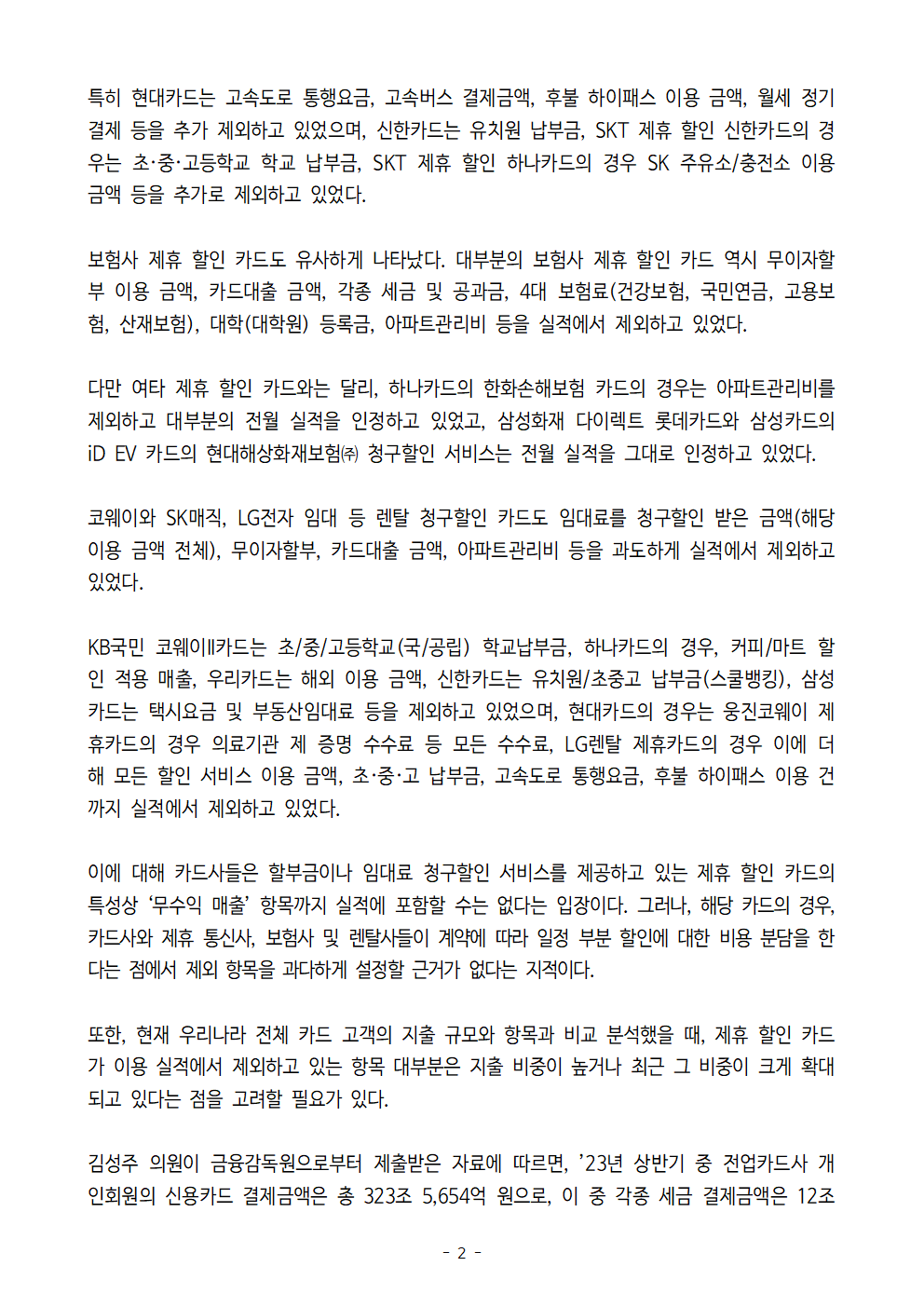 [김성주의원 보도자료] 제휴 할인 카드, 실제 할인 혜택 받기 어려워… '실적 제외 항목' 과다