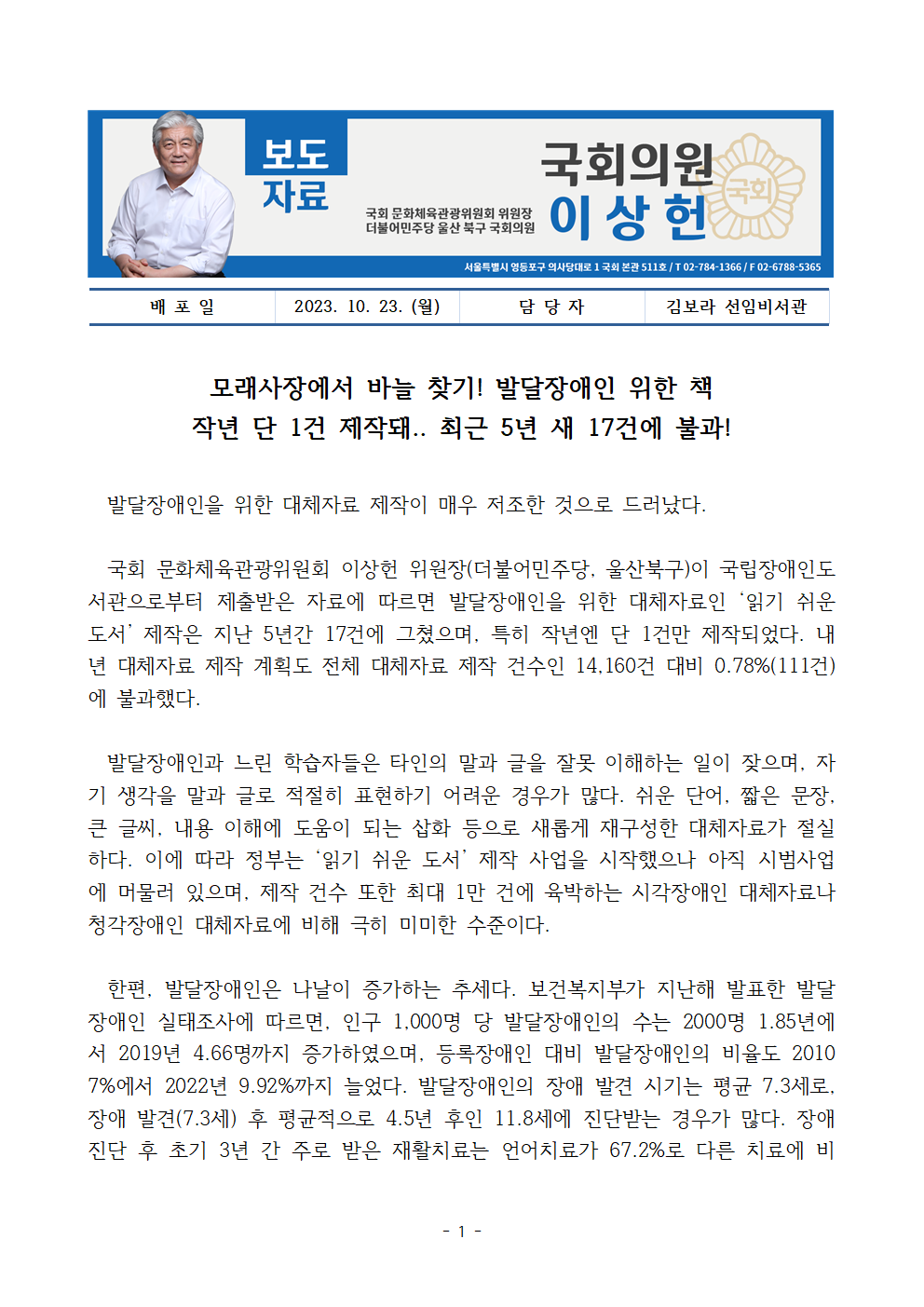 [국회의원 이상헌 보도자료] 모래사장에서 바늘 찾기! 발달장애인 위한 책 작년 단 1건 제작돼.. 최근 5년 새 17건에 불과!