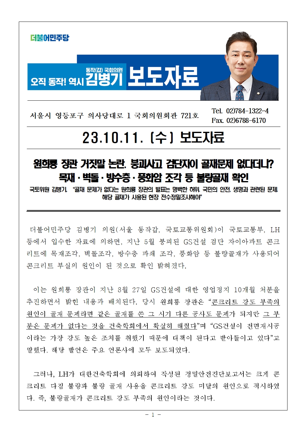 231011_김병기의원_보도자료_원희룡장관의_거짓말_논란_붕괴된_검단자이_골재문제_없다더니.hwp