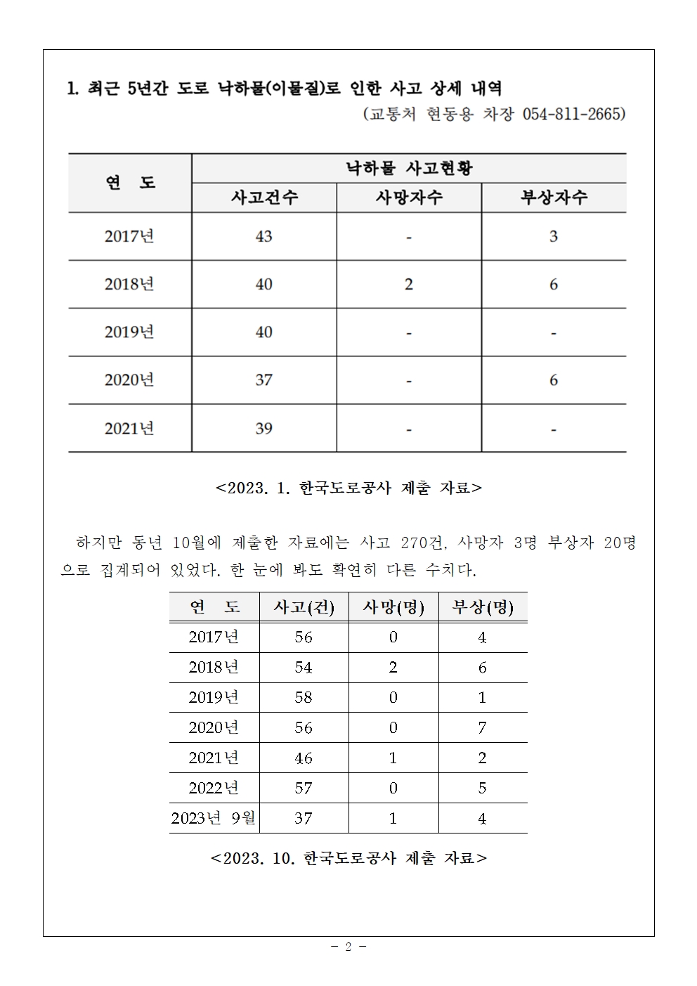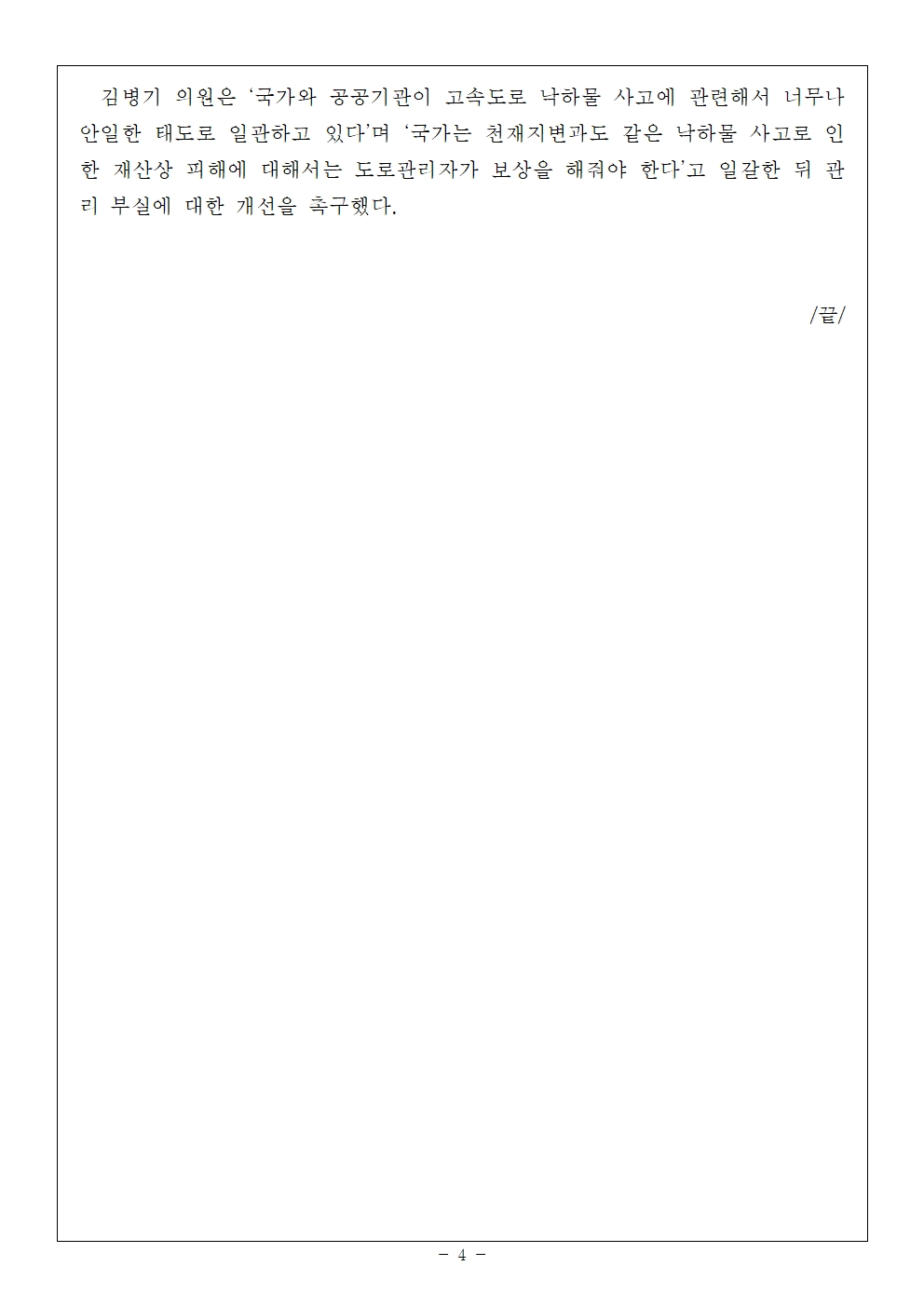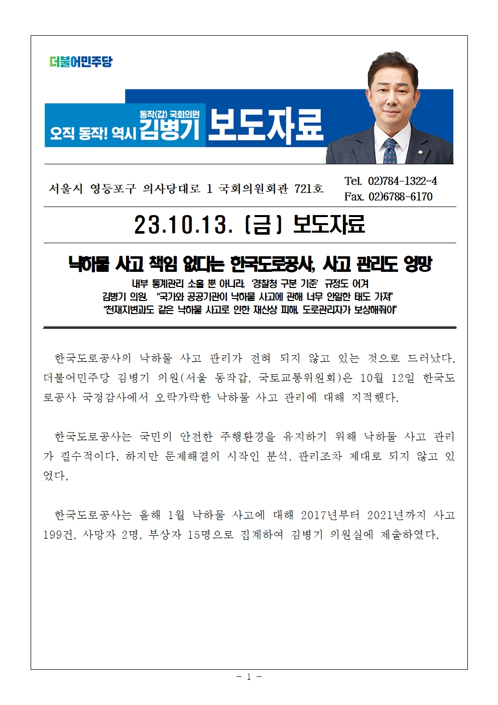 [국회의원 김병기 보도자료] 낙하물 사고 책임 없다는 한국도로공사, 사고 관리도 엉망