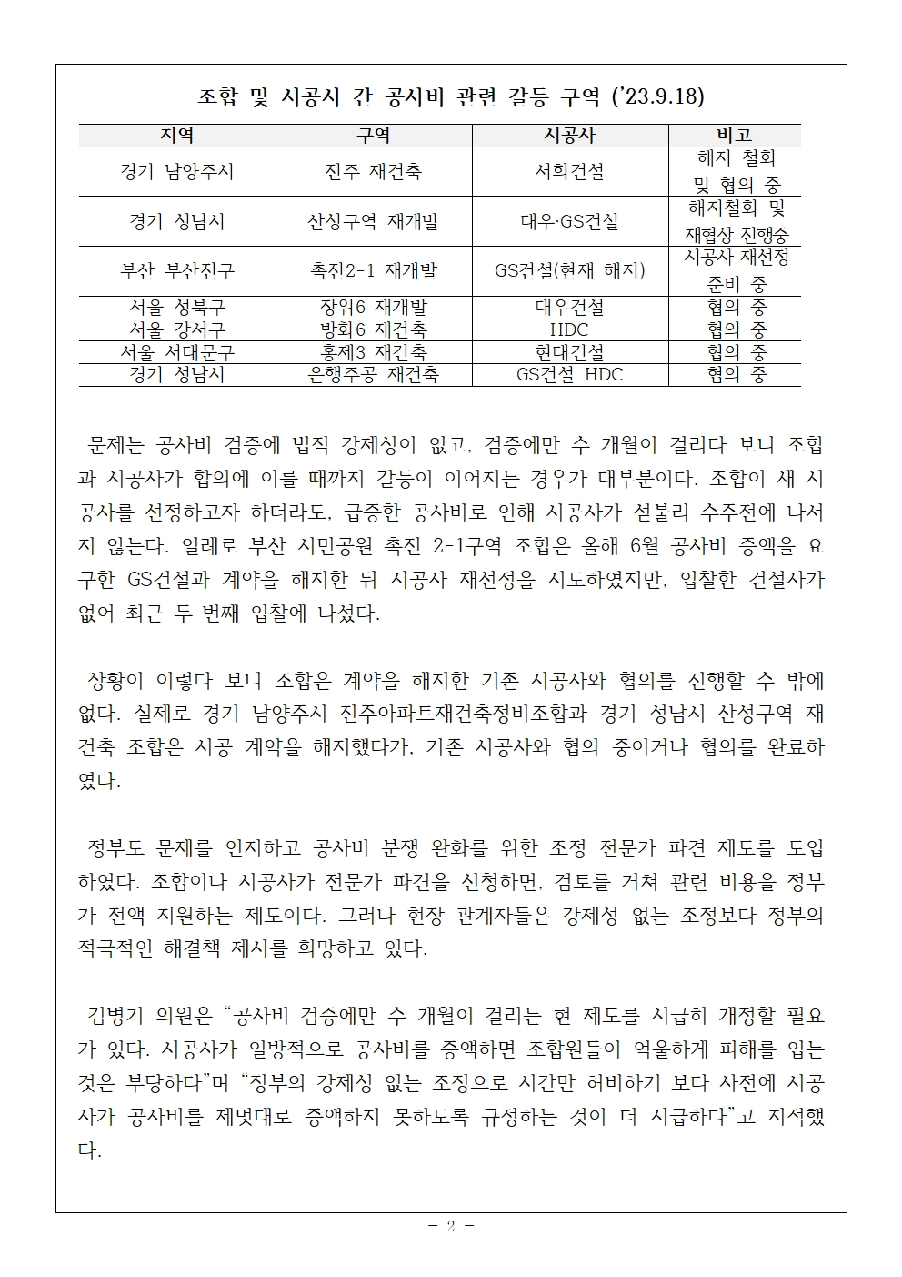 [국회의원 김병기 보도자료] 재건축 조합은 공사비로 죽어가는데, 정부는 탁상행정