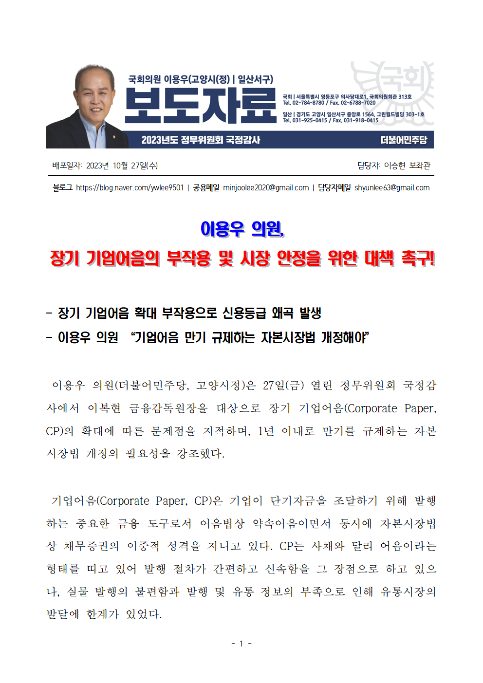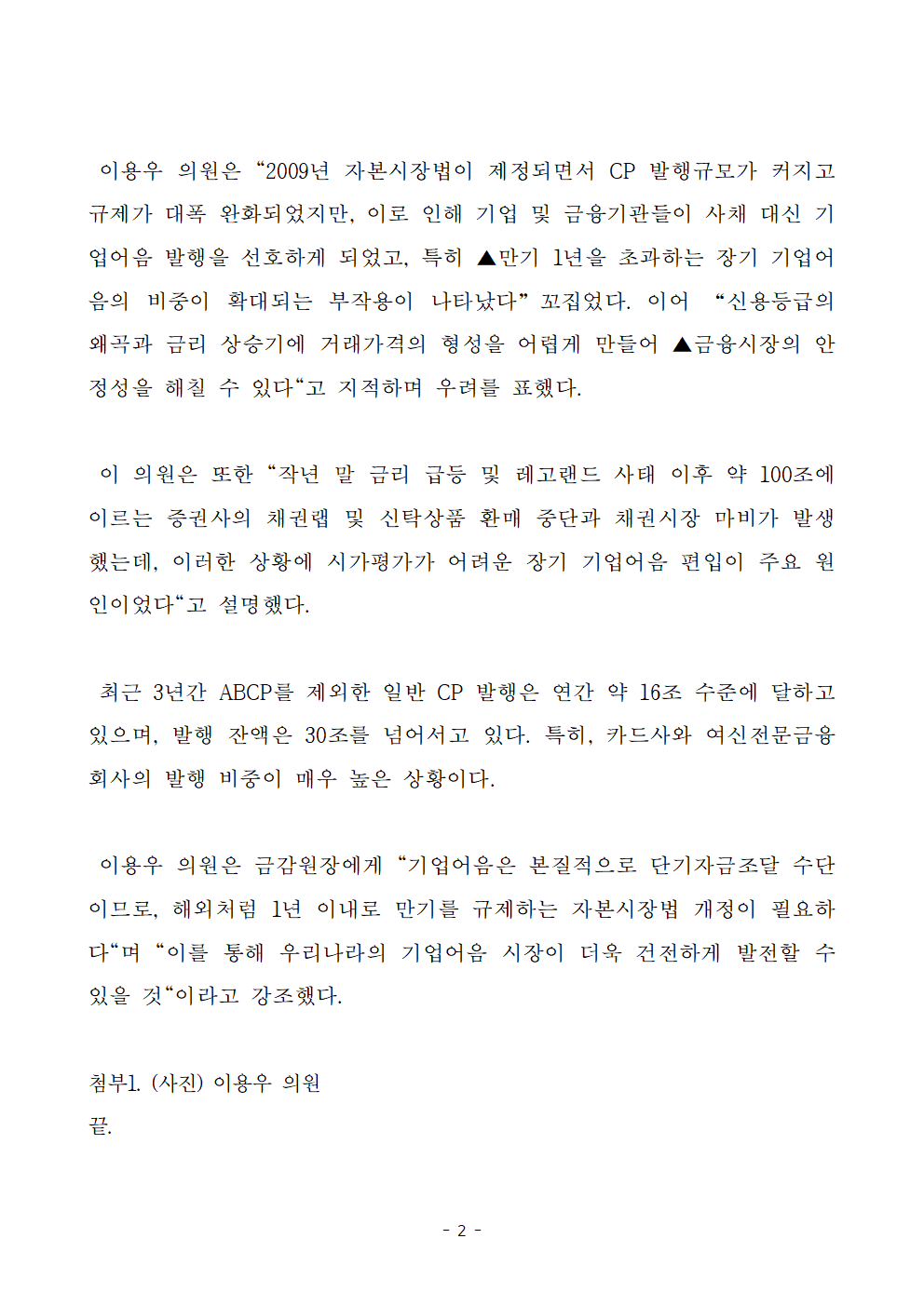 [보도자료] 이용우 의원_ 장기 기업어음의 부작용 및 시장 안정을 위한 대책 촉구.hwp