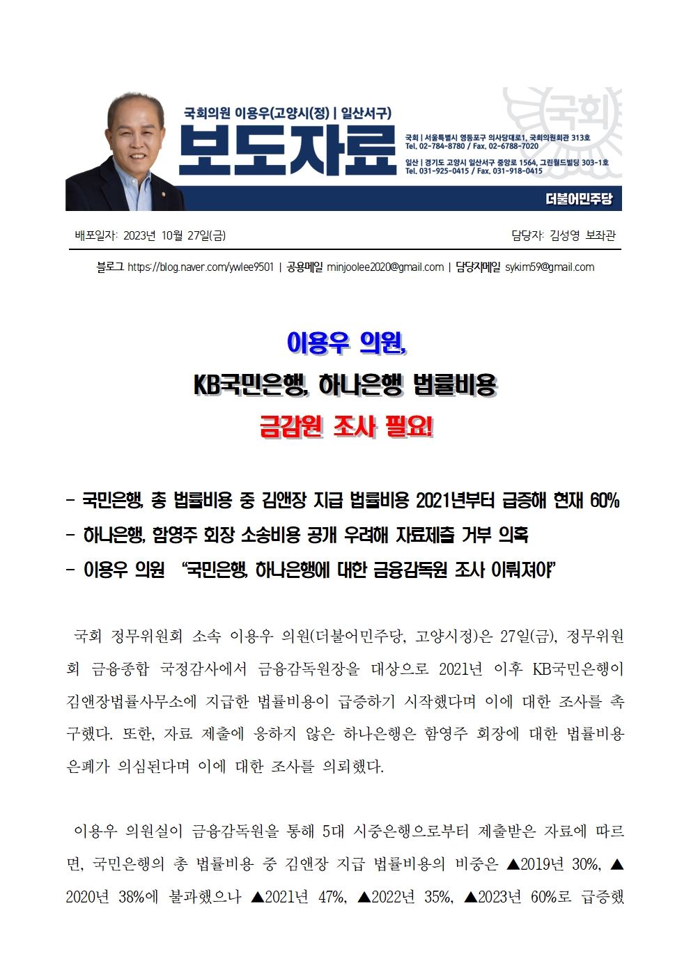 [보도자료] 이용우 의원 KB국민은행 하나은행 법률비용 금감원 조사 필요.hwp