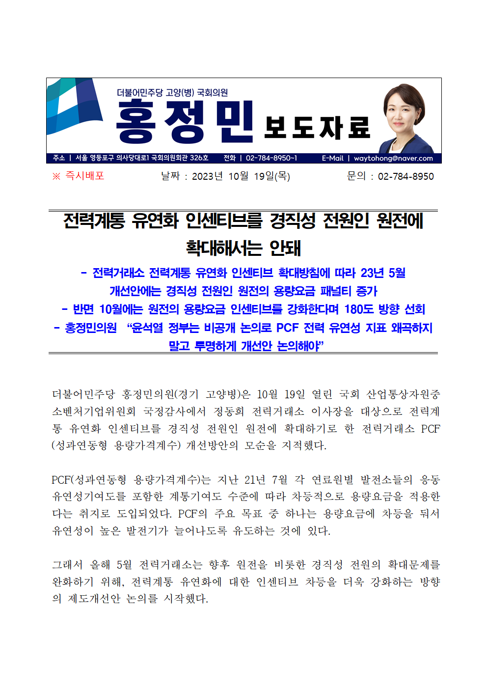 231019_보도자료_홍정민의원_전력계통_유연화_인센티브를_경직성_전원인_원전에_확대해서는_안돼.hwp