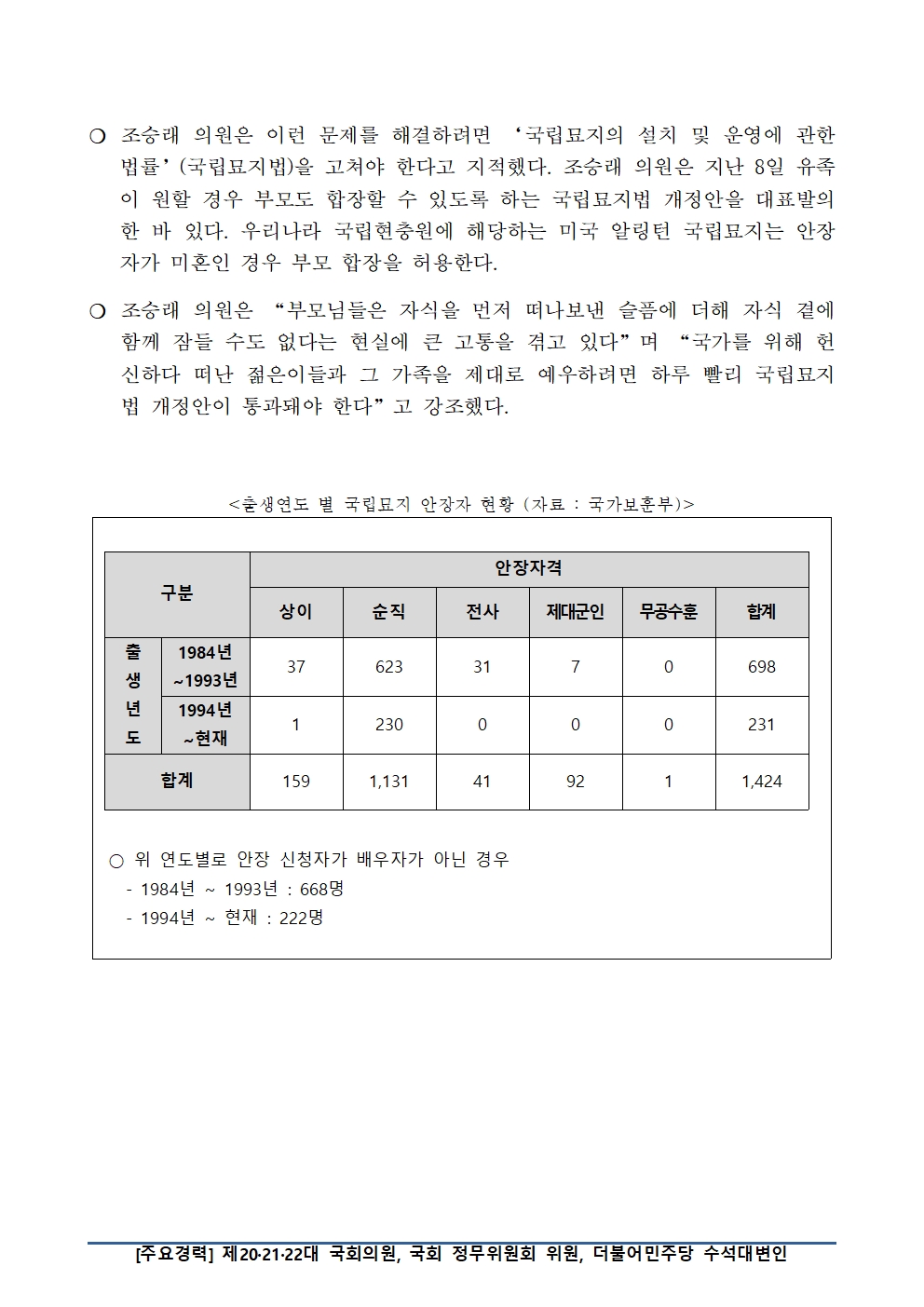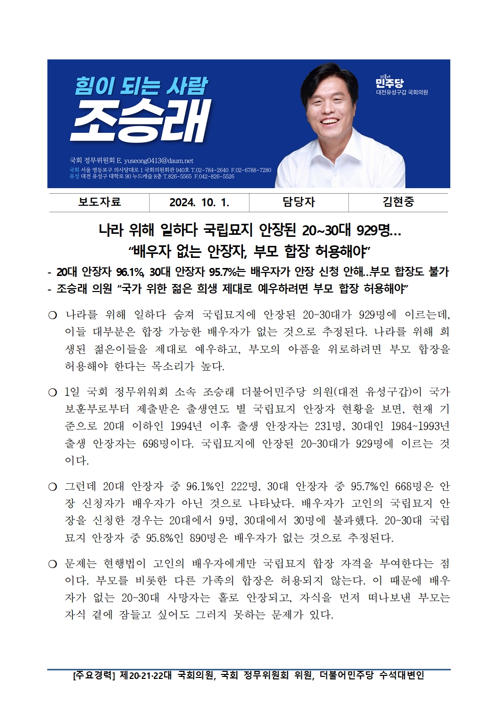 [국회의원 조승래] 나라 위해 일하다 국립묘지 안장된 20~30대 929명… “배우자 없는 안장자, 부모 합장 허용해야”