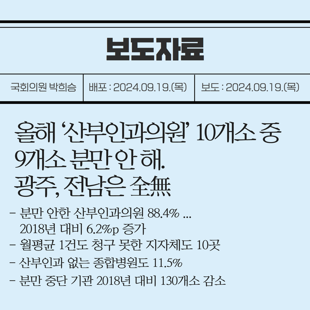 [국회의원 박희승 보도자료] 올해 ‘산부인과의원’ 10개소 중 9개소 분만 안 해. 광주, 전남은 全無