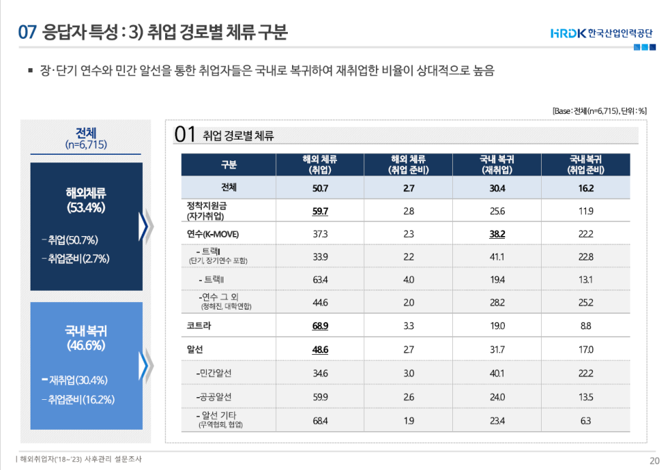 특히, 산업인력공단 지원 사업 국내 복귀자 중 38.2%는 국내로 재취업했으나, 22.2%는 다시 취업준비를 하고 있는 것으로 나타났다.