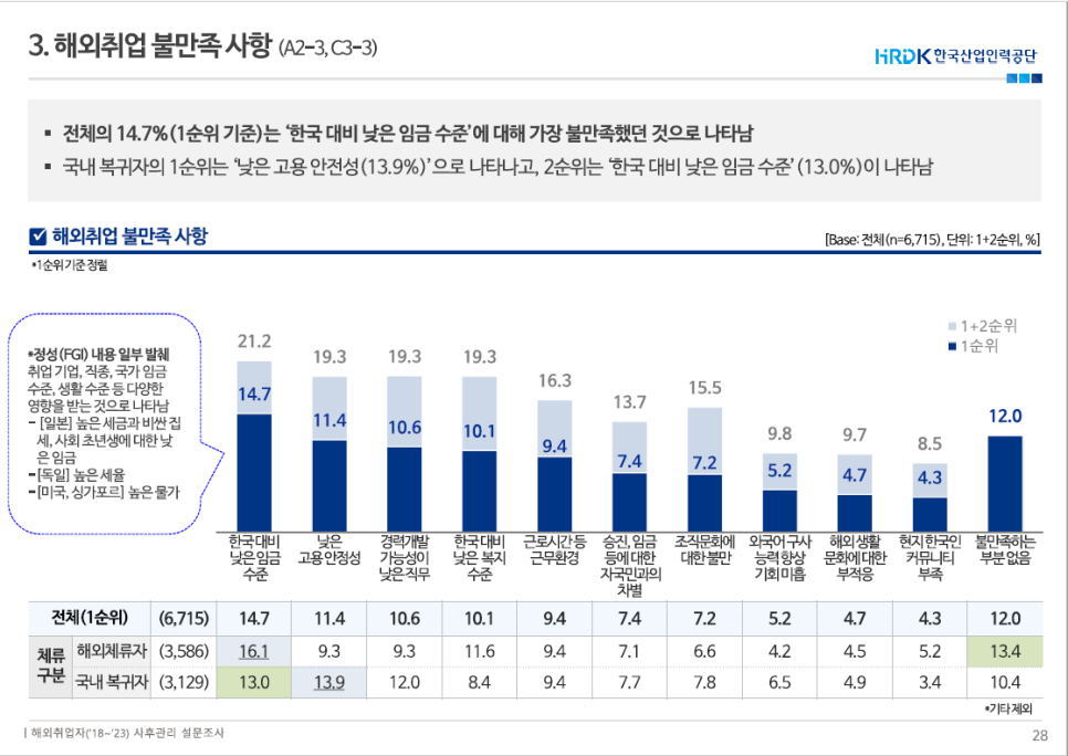 국내 복귀자의 해외 취업 불만족 사유로는 ‘낮은 고용 안전성’(13.9%)이 가장 높았고, 한국 대비 낮은 임금수준(13.0%)이 뒤를 이었다.