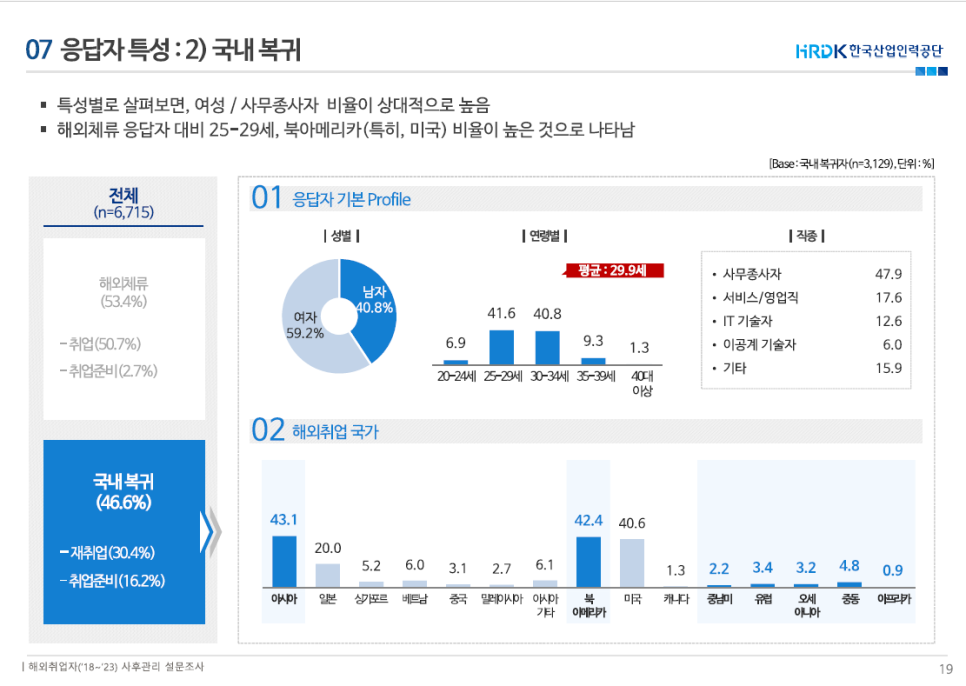 국내 복귀자는 여성(59.2%) 비율이 남성(40.8%)보다 높았고, 연령별로는 25~29세 복귀자가 41.6%로 가장 많았으며, 복귀자 평균 연령은 29.9세로 나타났다.