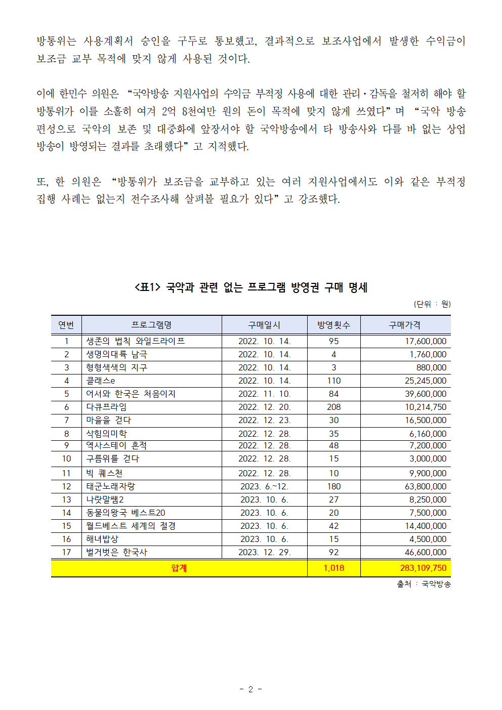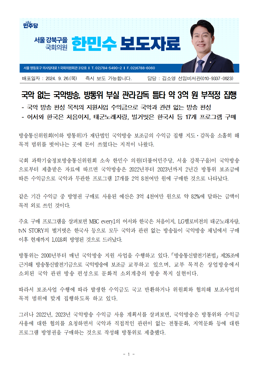 보도자료_한민수의원_국악_없는_국악방송_방통위_부실_관리‧감독_틈타_약_3억_원_부적정_집행.hwp