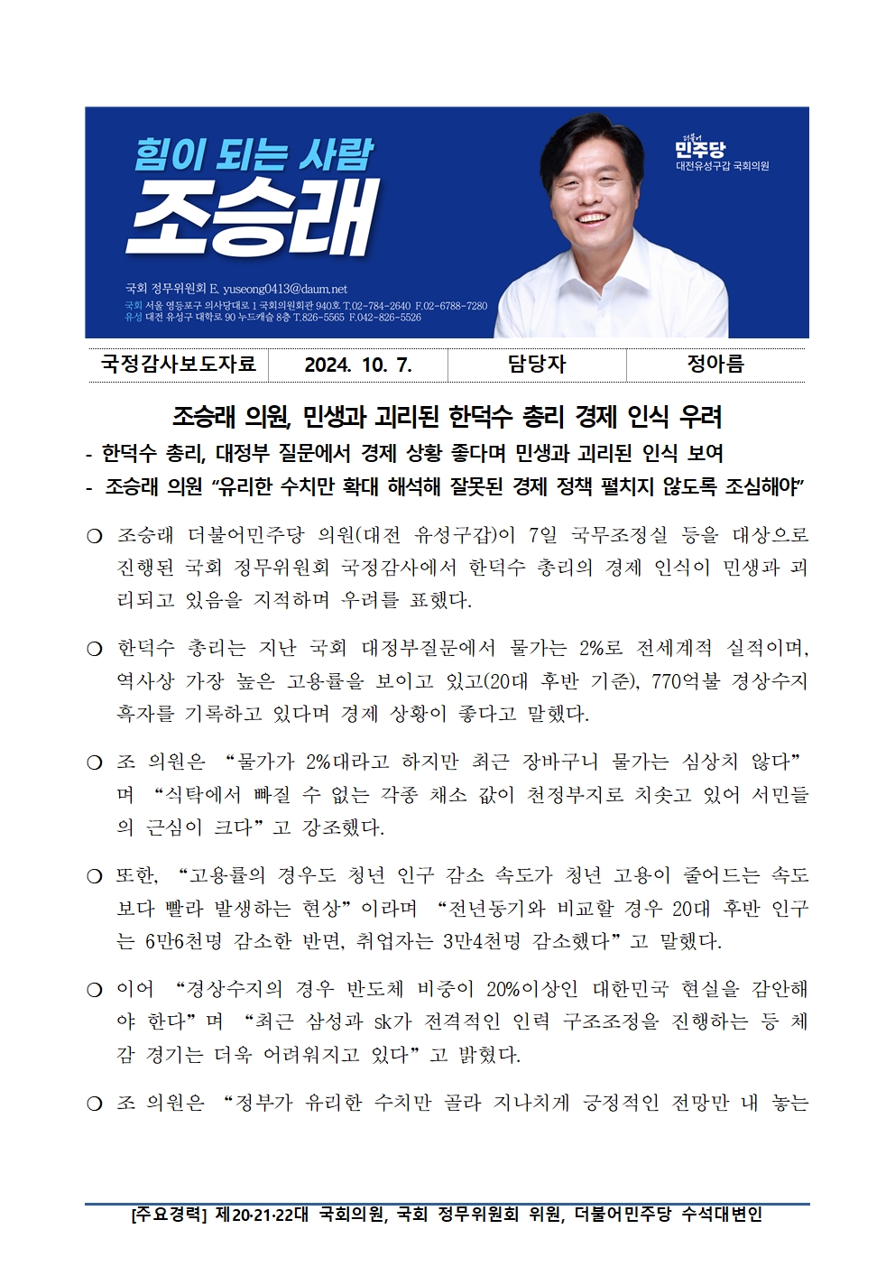 [국회의원 조승래] 조승래 의원, 민생과 괴리된 한덕수 총리 경제 인식 우려