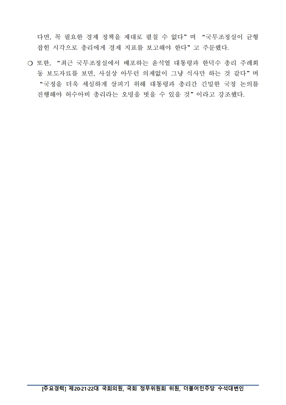 조승래 의원 민생과 괴리된 한덕수 총리 경제 인식 우려.hwp