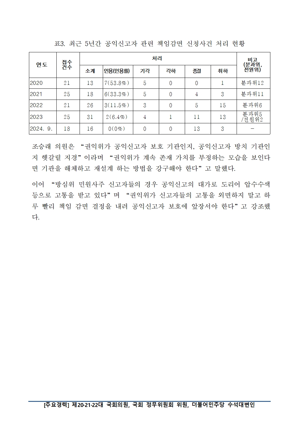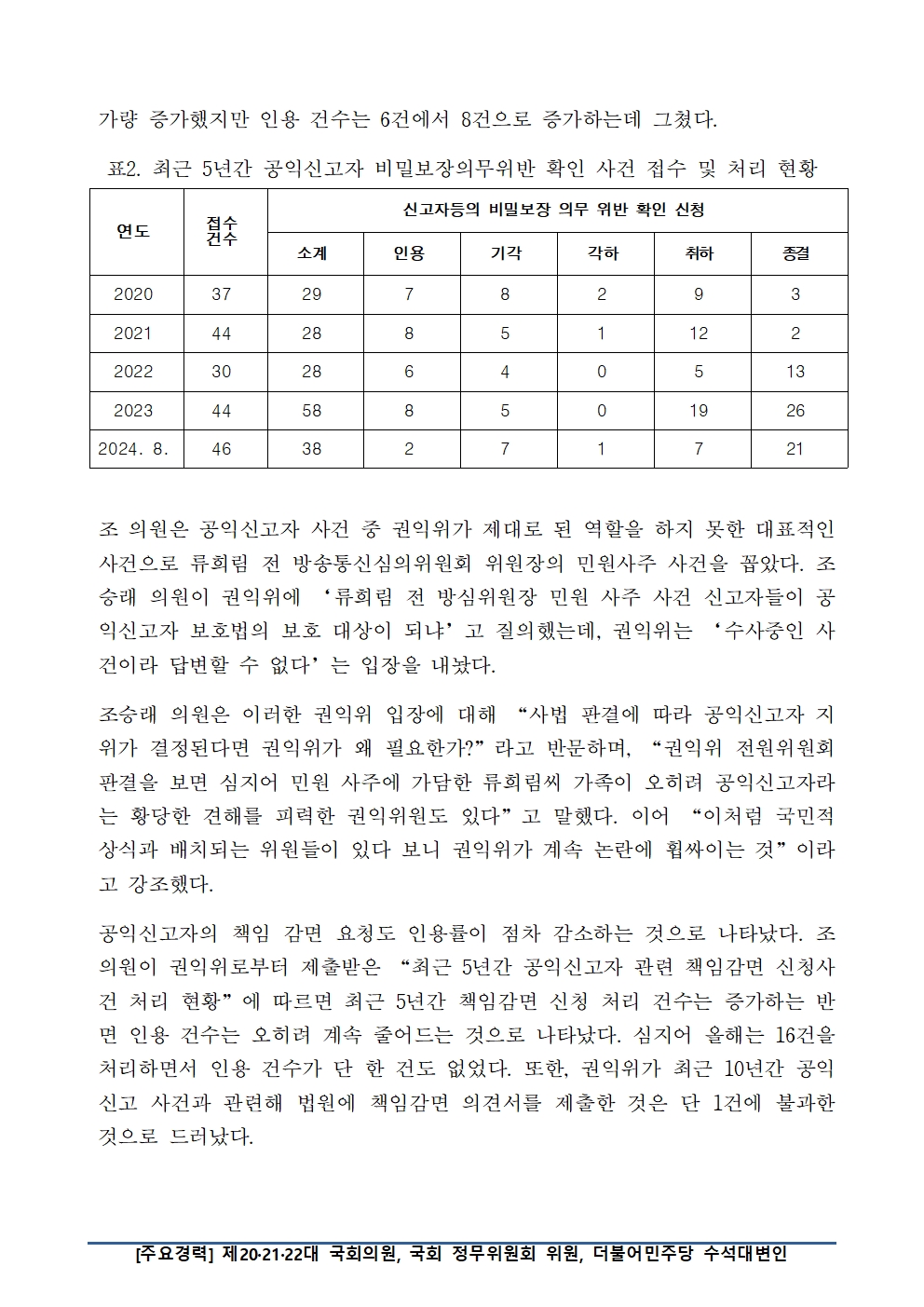 [국회의원 조승래] 권익위, 공익신고자 보호조치 및 불이익조치 금지 요청 올해 단 1건 인용