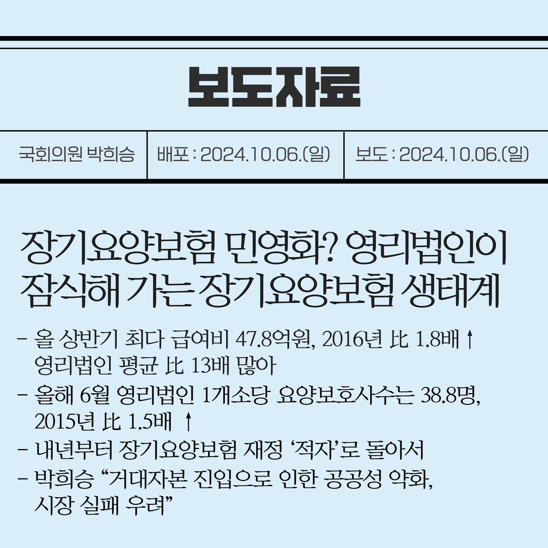 [국회의원 박희승 보도자료] 장기요양보험 민영화? 영리법인이 잠식해 가는 장기요양보험 생태계