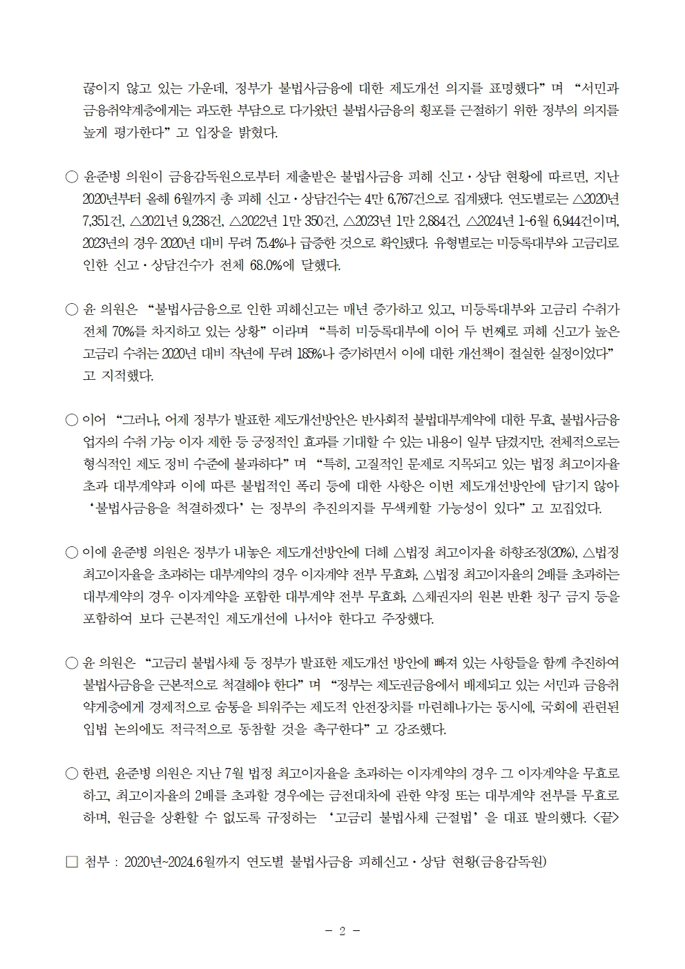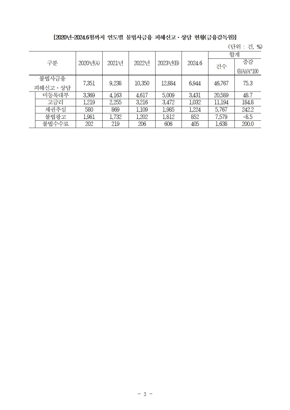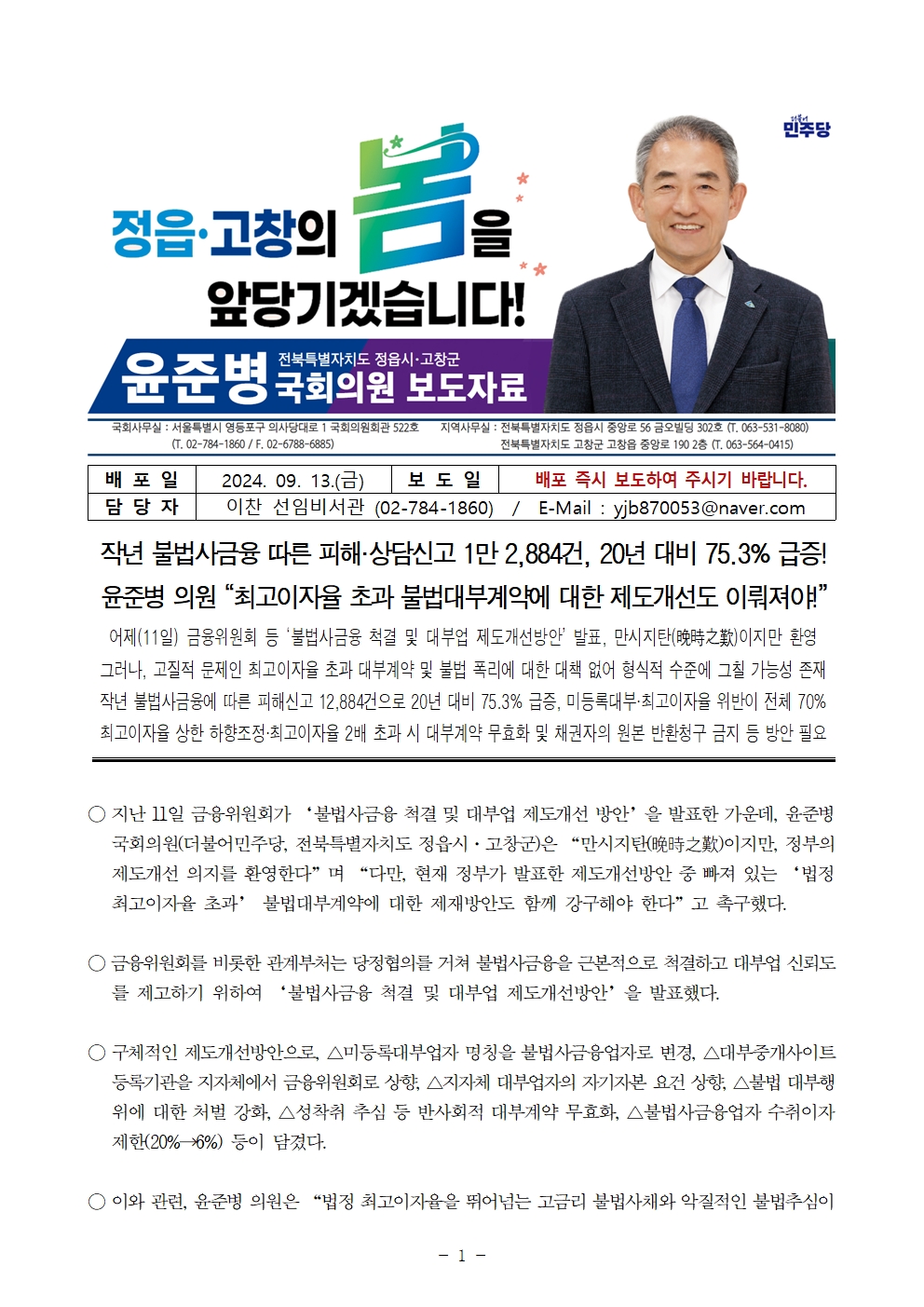 240913 [윤준병 의원 국정감사 보도자료] 작년 불법사금융 피해신고 20년 대비 75.3% 급증! (1).hwp