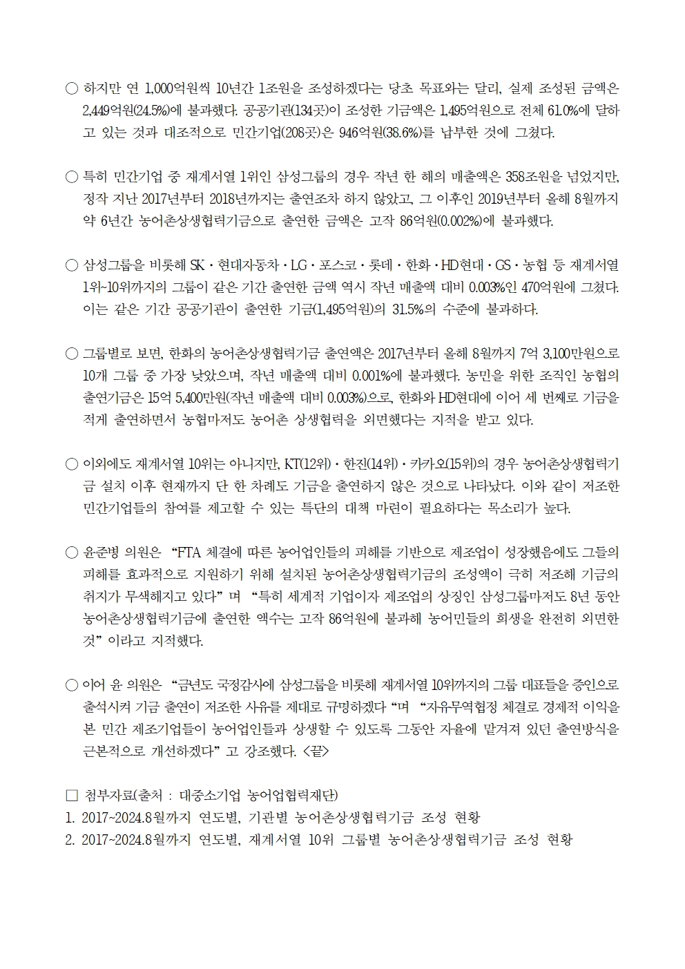 240924 [윤준병 의원 국정감사 보도자료] 재계서열 상위 10위 그룹이 8년간 출연한 농어촌상생기금_ 작년 매출액의 고작 0.003% 불과! (1).hwp