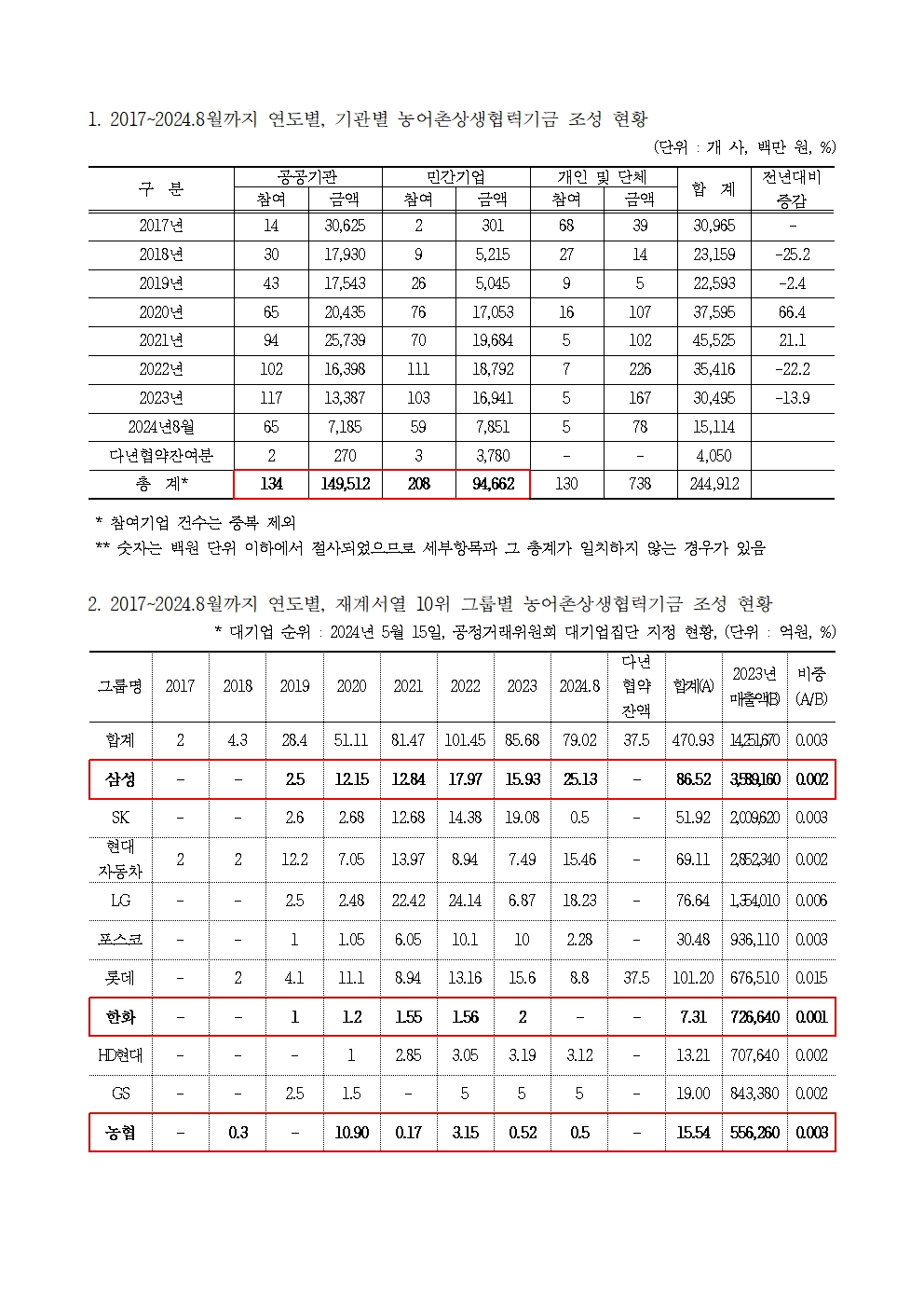 [윤준병 의원 국정감사 보도자료] 재계서열 상위 10위 그룹이 8년간 출연한 농어촌상생기금_ 작년 매출액의 고작 0.003% 불과!