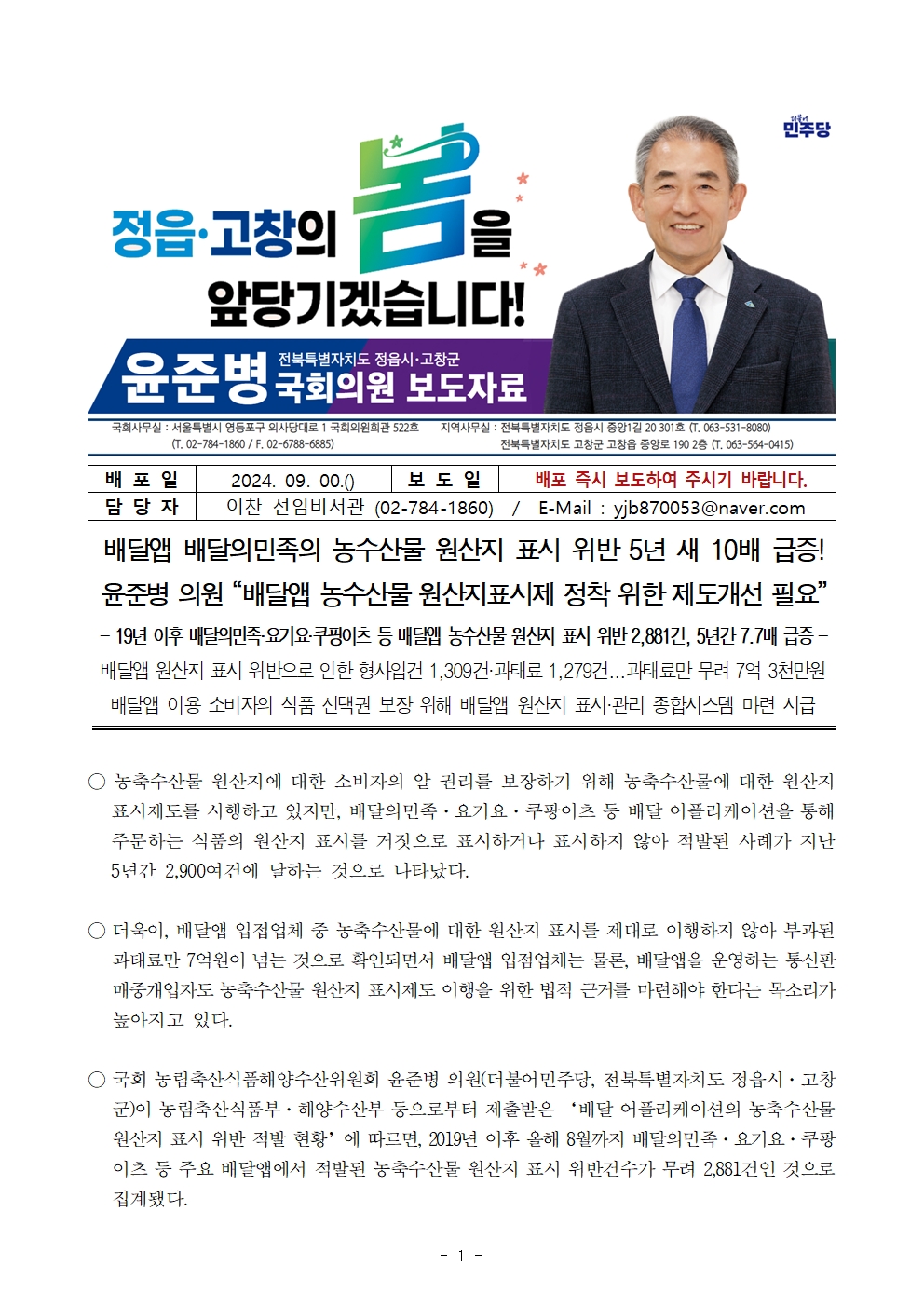 [윤준병 의원 국정감사 보도자료] 윤준병 의원_ 배달앱 배달의민족의 농수산물 원산지 표시 위반 5년 새 10배 급증