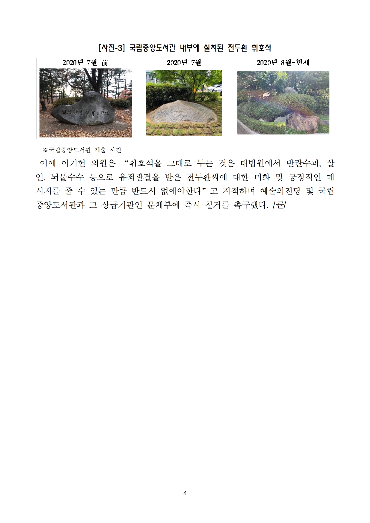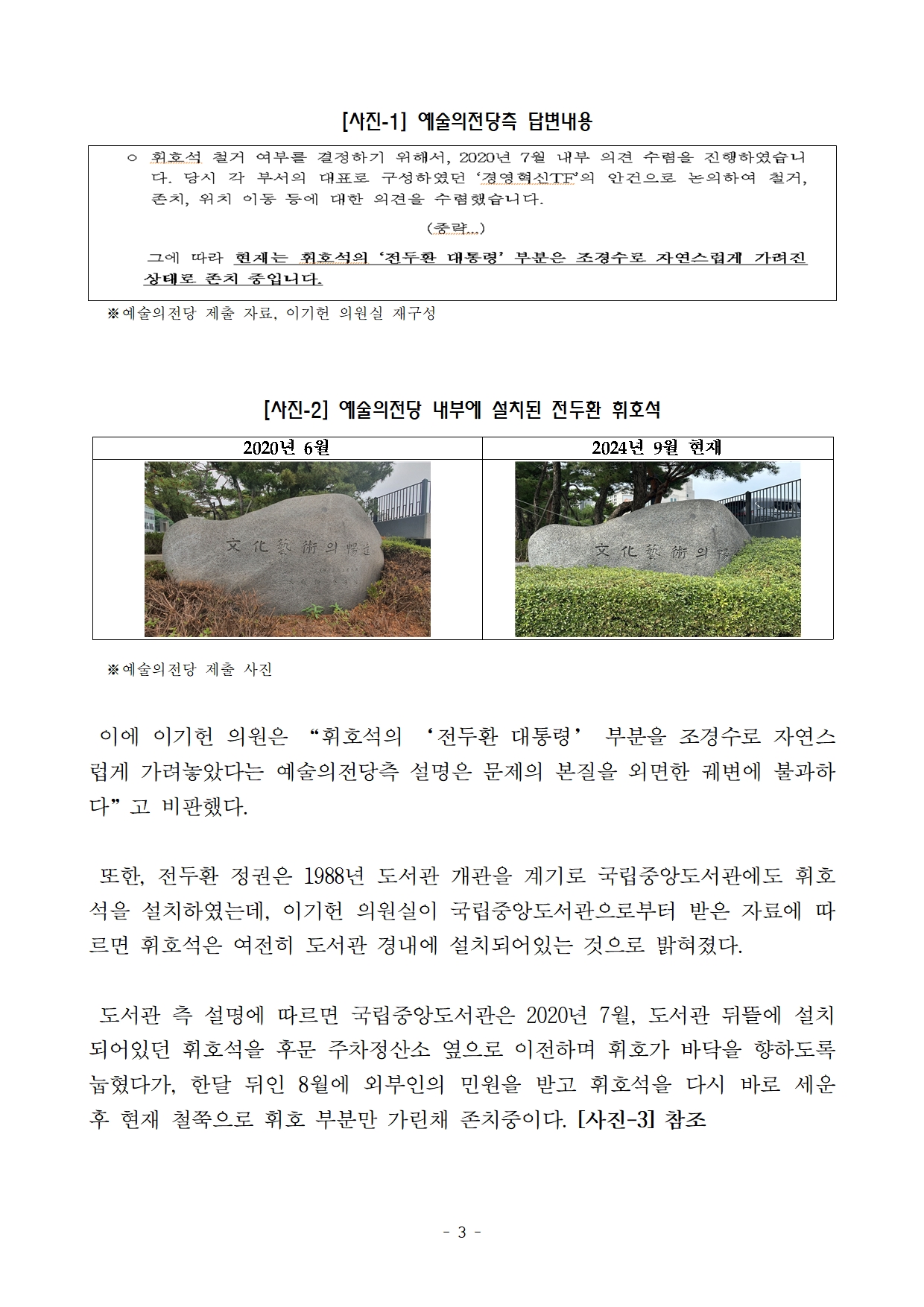 [이기헌 의원(고양시 병) 보도자료] 눈 가리고 아웅? 전두환 휘호석 철거 요청에 ‘조경수로 자연스럽게 가리기’ 선택한 예술의전당과 국립중앙도서관
