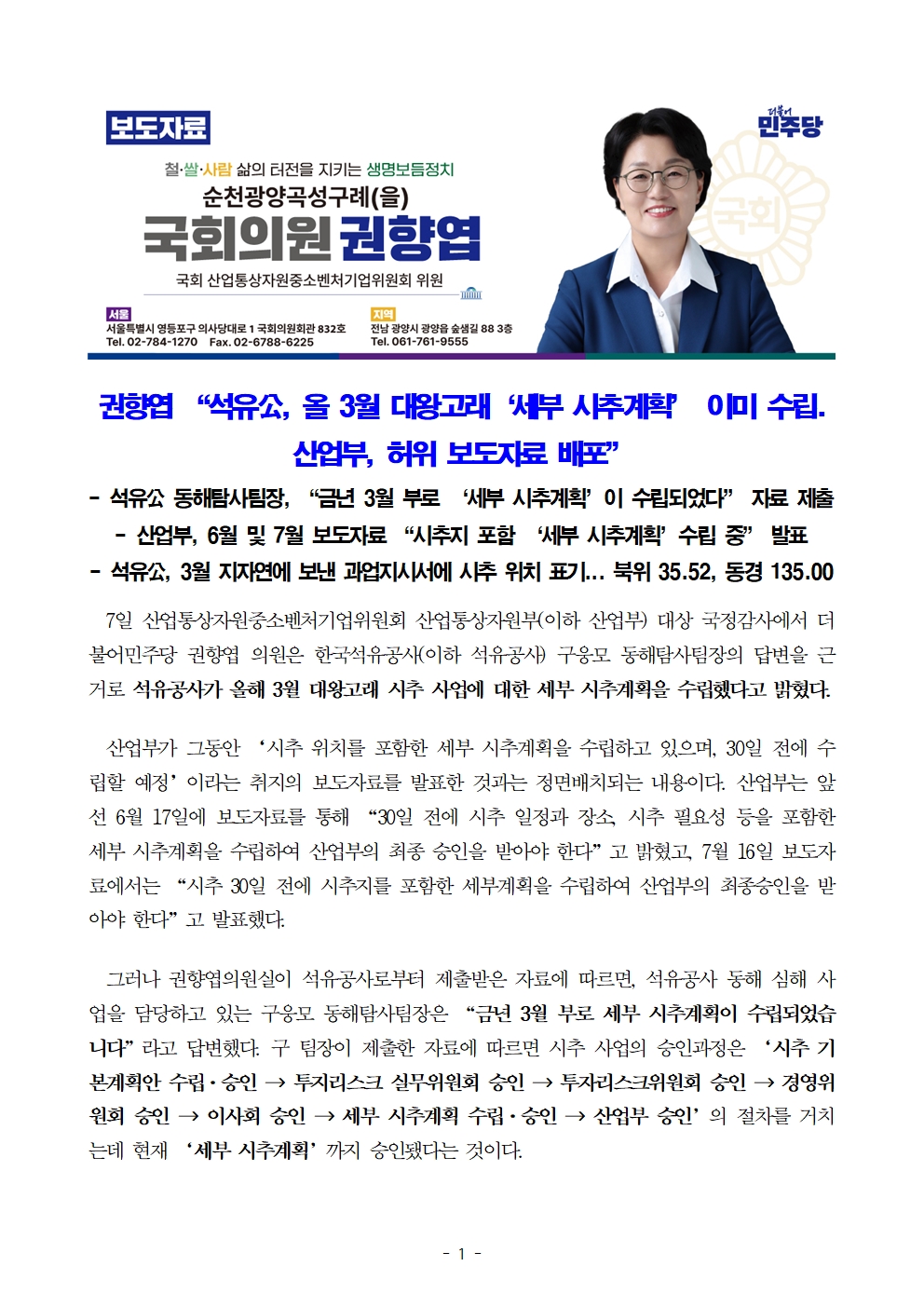 [국회의원 권향엽] 석유公, 올 3월 대왕고래 '세부 시추계획' 이미 수립. 산업부, 허위 보도자료 배포