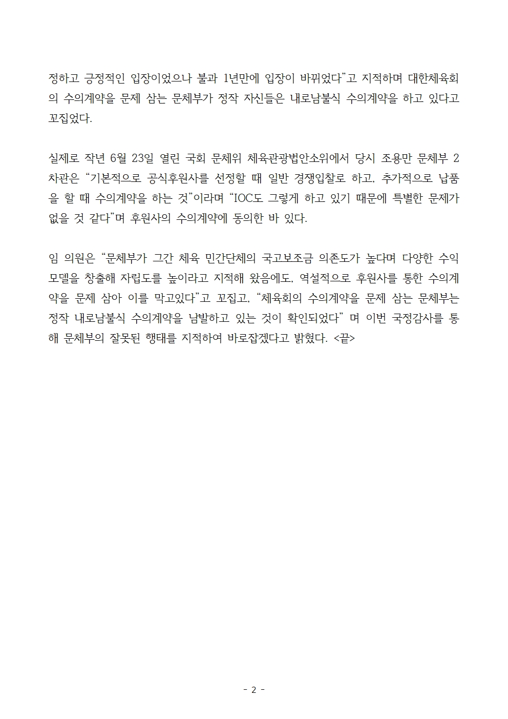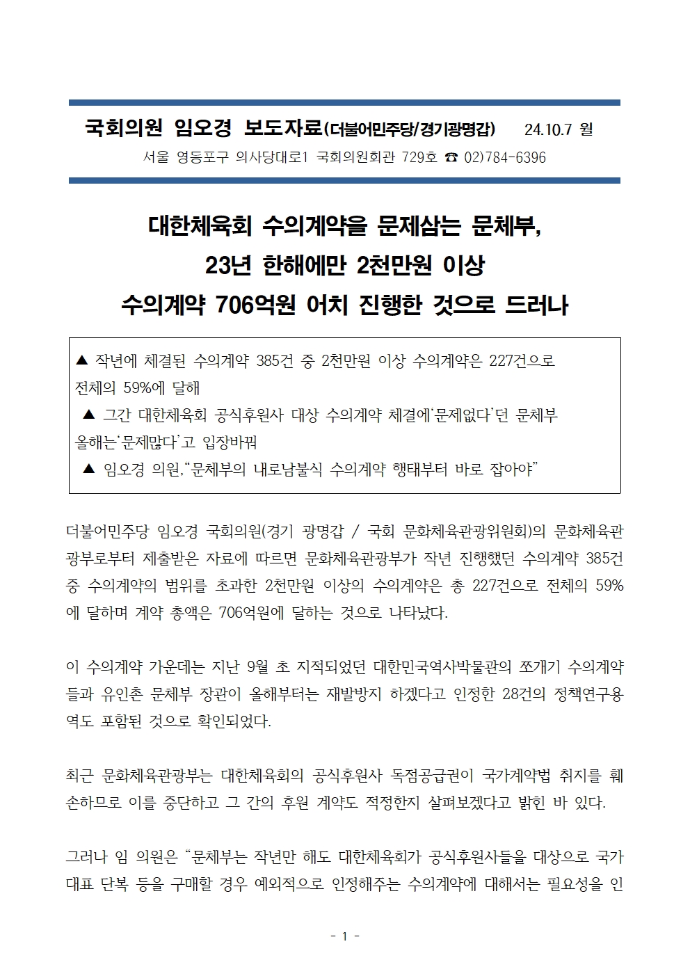 24.10.07_임오경 국회의원보도_대한체육회 수의계약을 문제삼는 문체부_23년 한해에만 2천만원 이상 수의계약 706억원 어치 진행한것으로 드러나.hwp